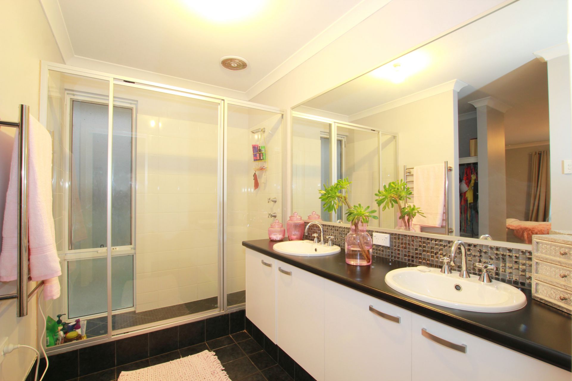 The large master suite is a spacious retreat away from the main living areas and three other bedrooms, featuring 'his and hers' walk in robes, double sinks in ensuite, separate toilet and large shower.
