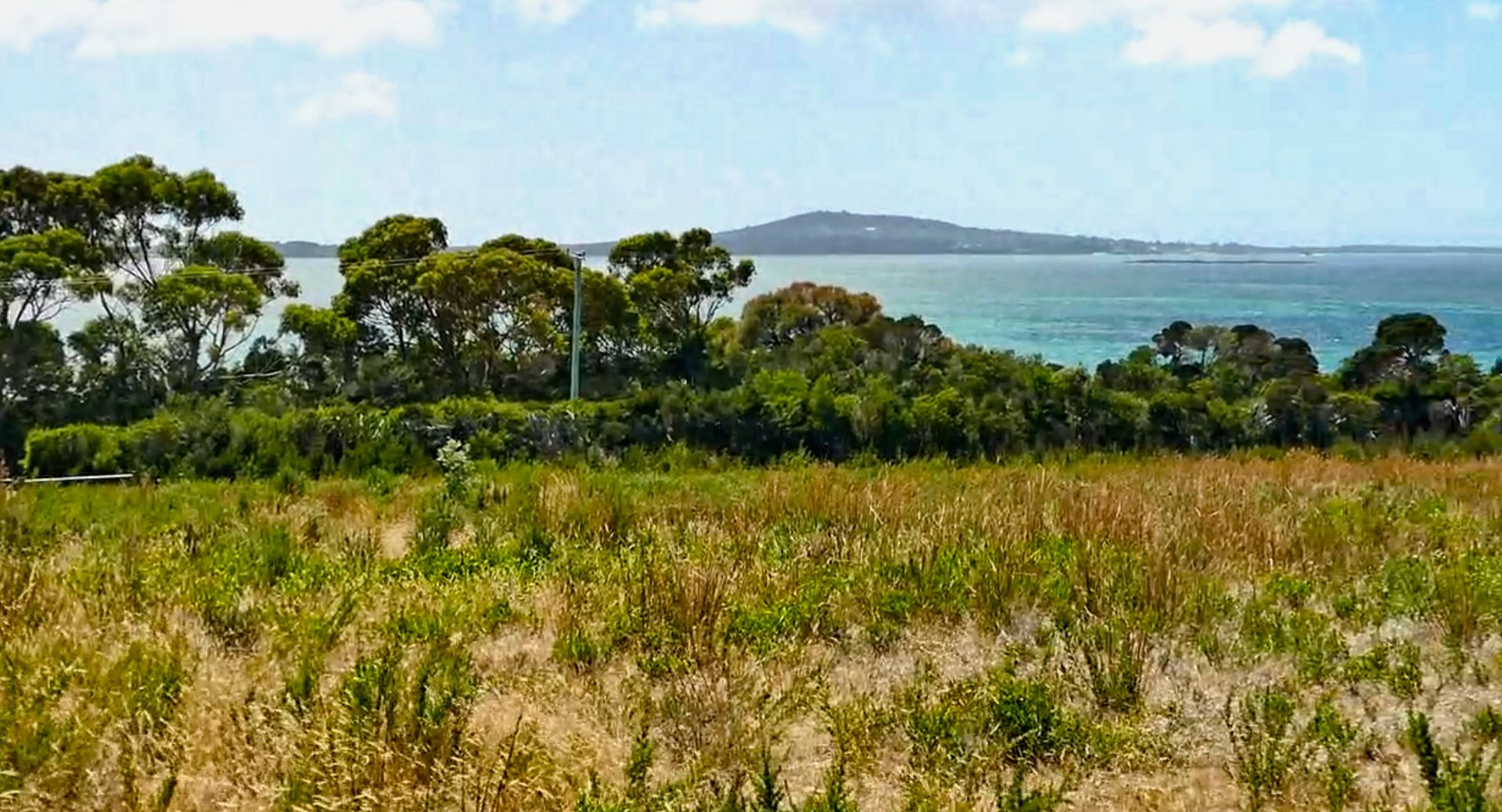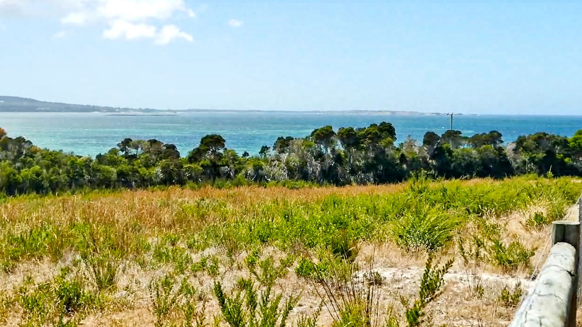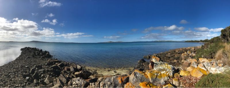 Vast pristine blue water views over Petrifaction Bay and surrounding islands of Franklin Sound - Little Dog and Big Dog Islands and Cape Barron Island lurking mysteriously in the background.