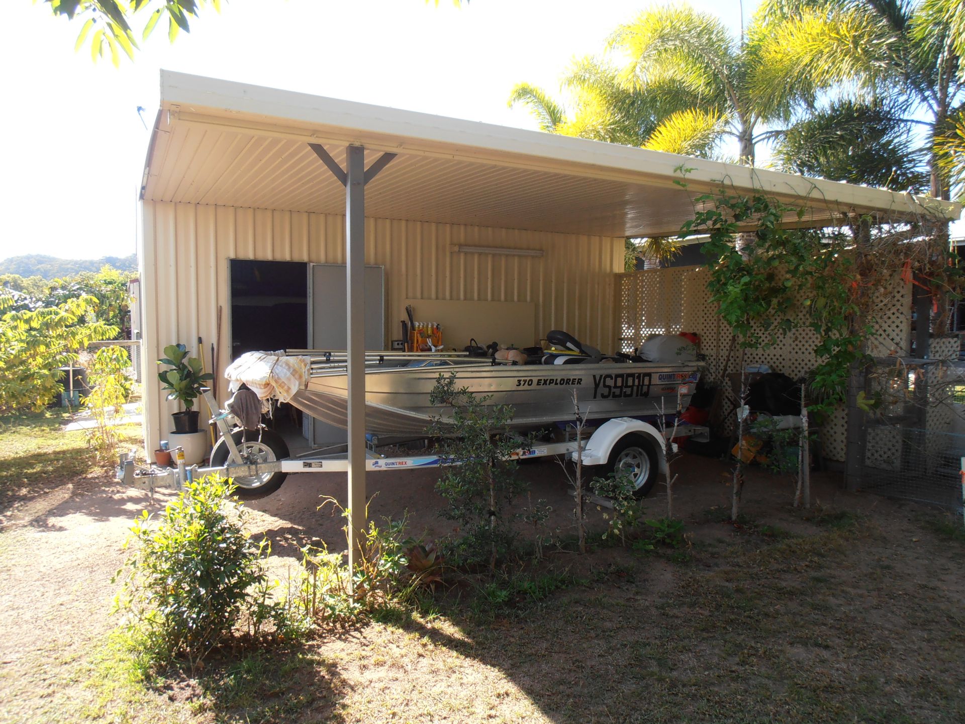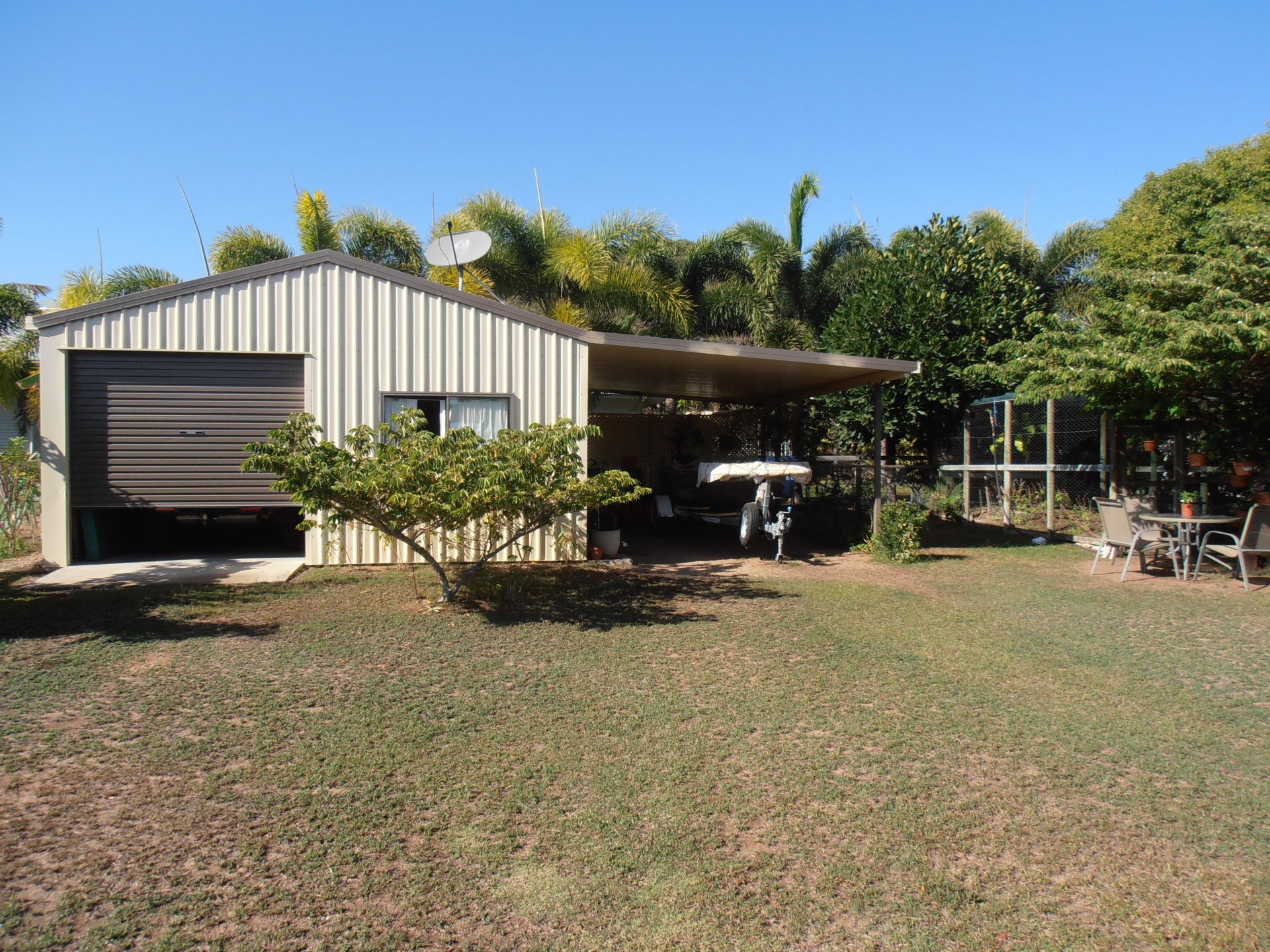 A Ranbuild 6.0m X 6.0m colourbond pitched shed, complete with large vehicle roller door access and also internal toilet, laundry tub and work area. The shed is adjoined by a 6.0m X 4.5m Skillion for undercover storage of a boat or caravan.