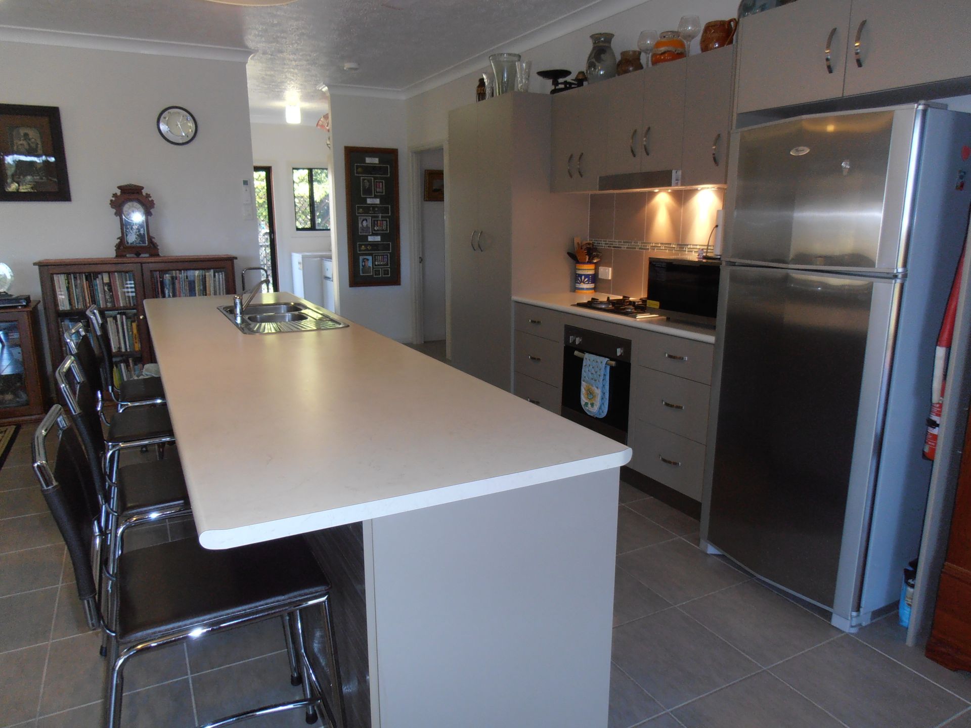 Open kitchen with large breakfast bar, gas and electric cooking, s.s. dishwasher, and pantry cupboard.