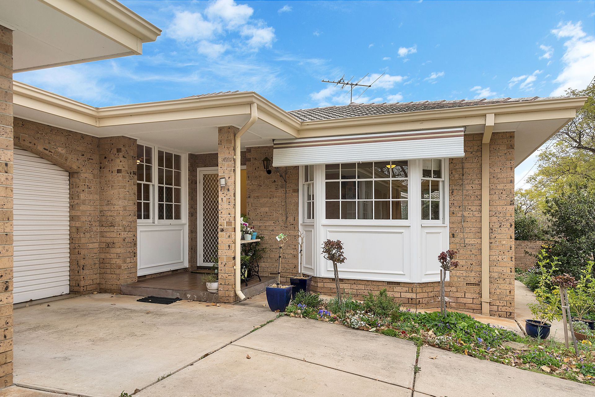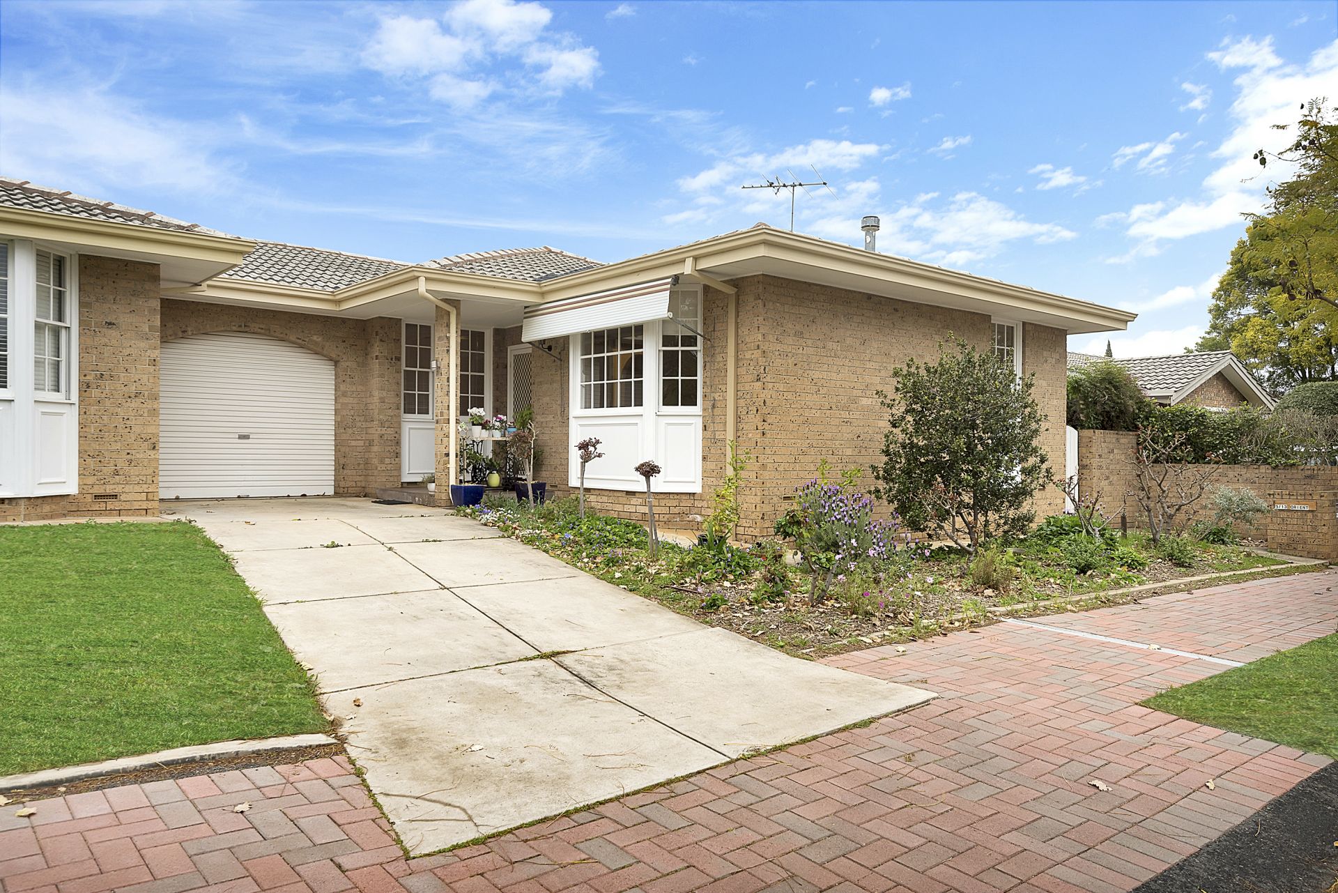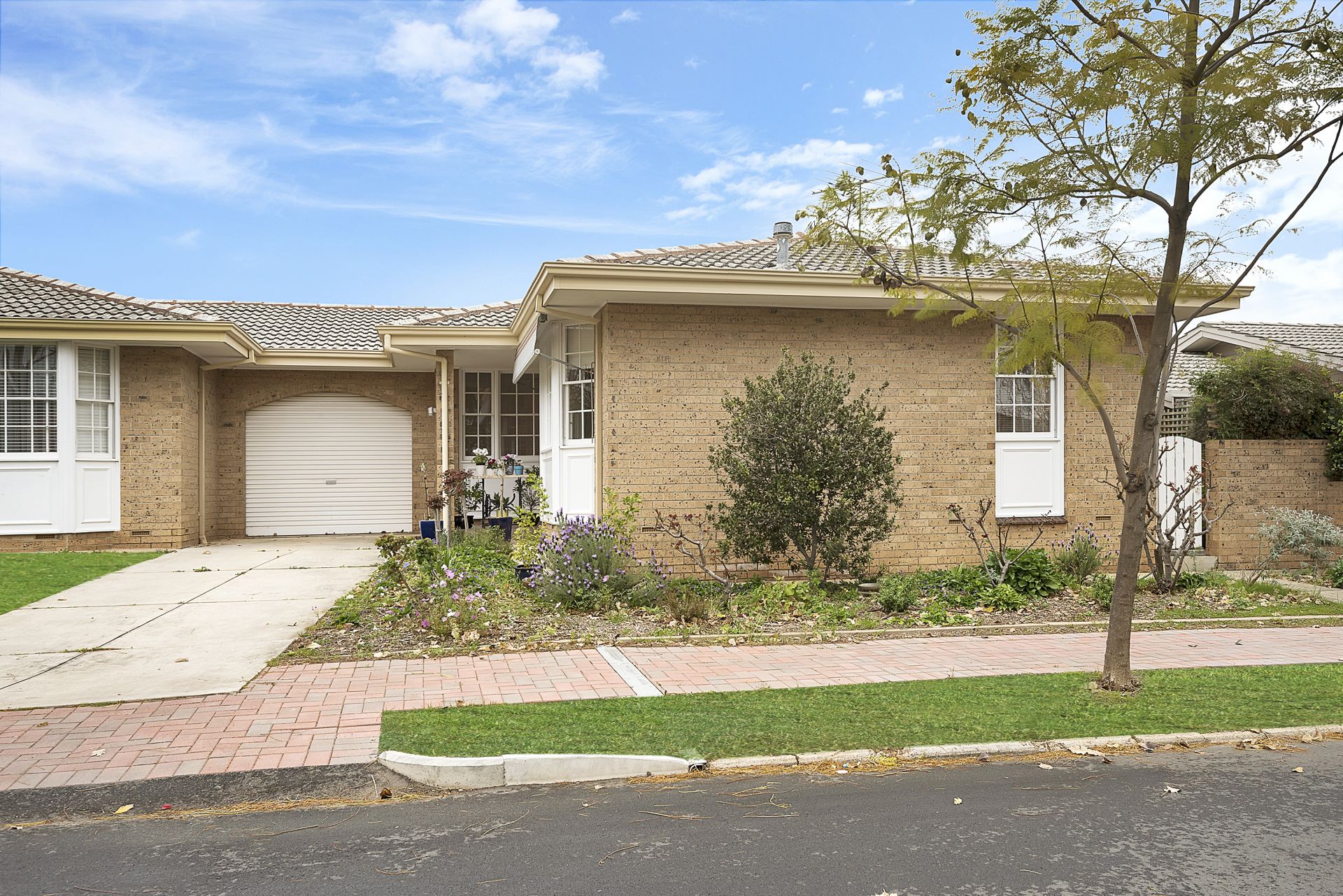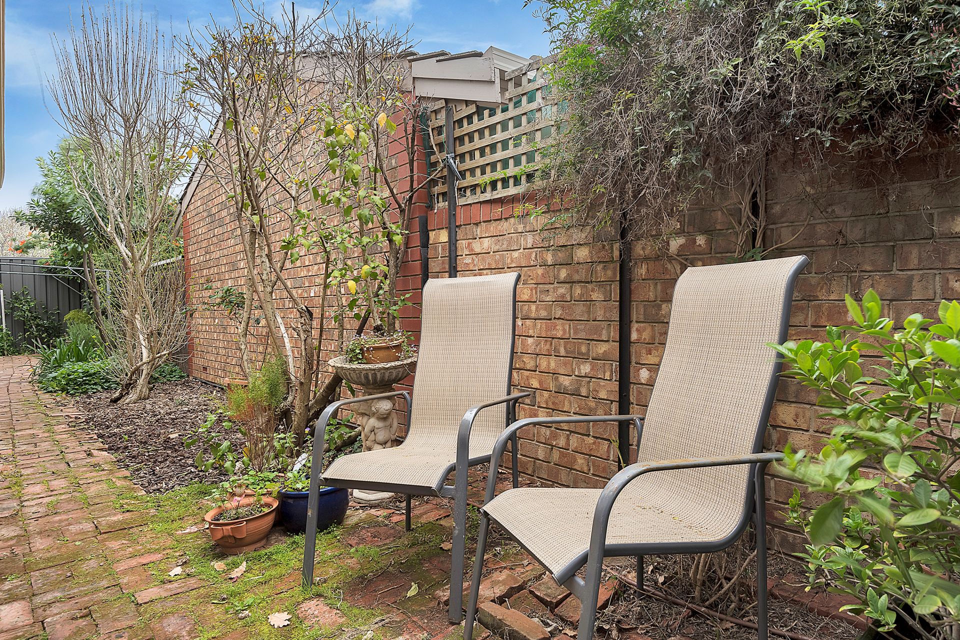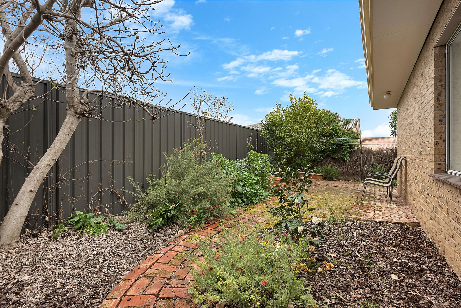 A paved courtyard provides a pleasant outdoor living area. The rear garden includes an established fig tree and lemon and mandarin trees.