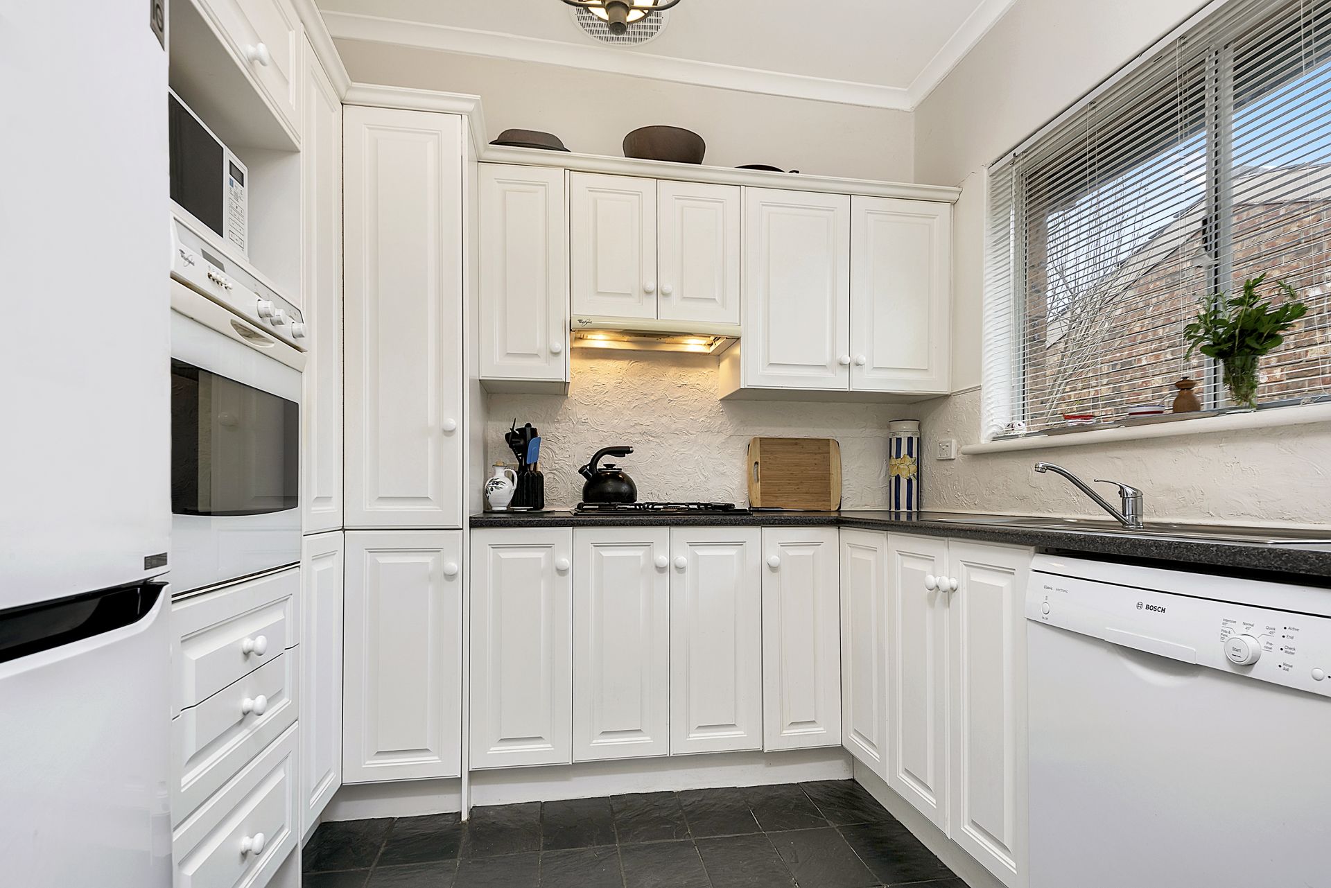 and bench space. A Bosch dishwasher and gas cooktop equip this functional kitchen.