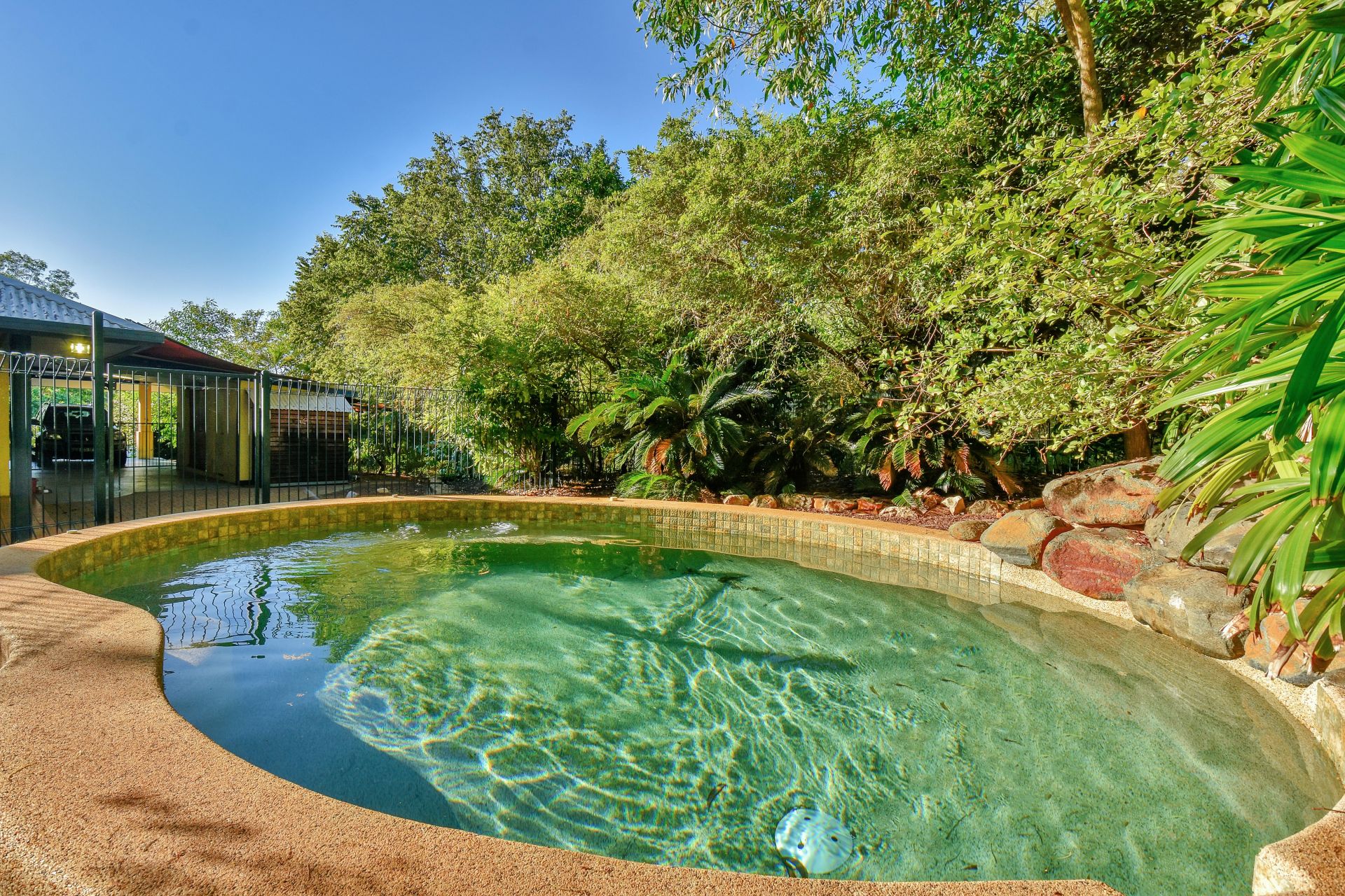 • In-ground saltwater pool with cascading waterfall