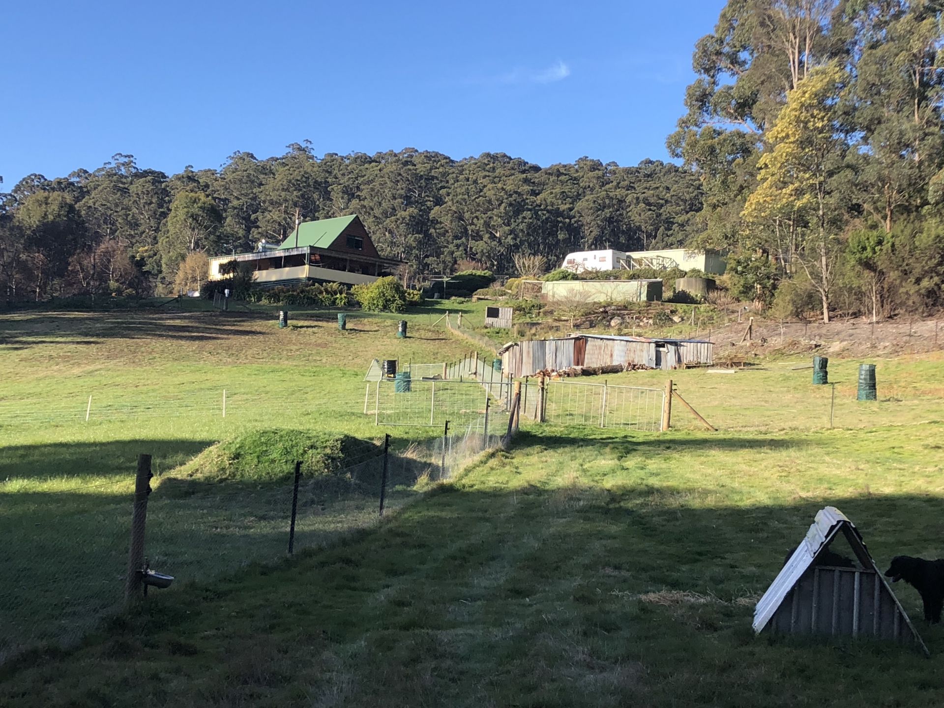 Three good sized paddocks with wallaby/possum/rabbit proof mesh and electric fencing. All paddocks with water troughs. Shed with stock pens and feed/wood storage areas and 1500L water tank.