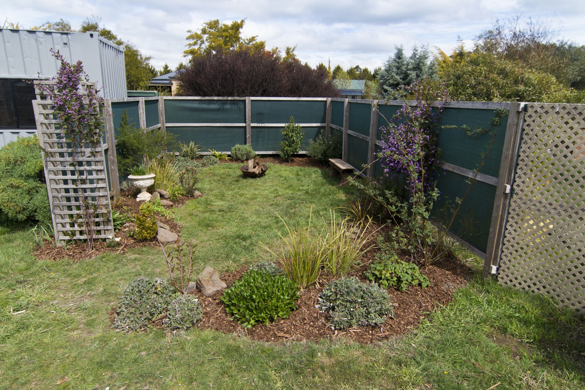 Fully fenced yard with rolling lawns & picturesque, easy care gardens
