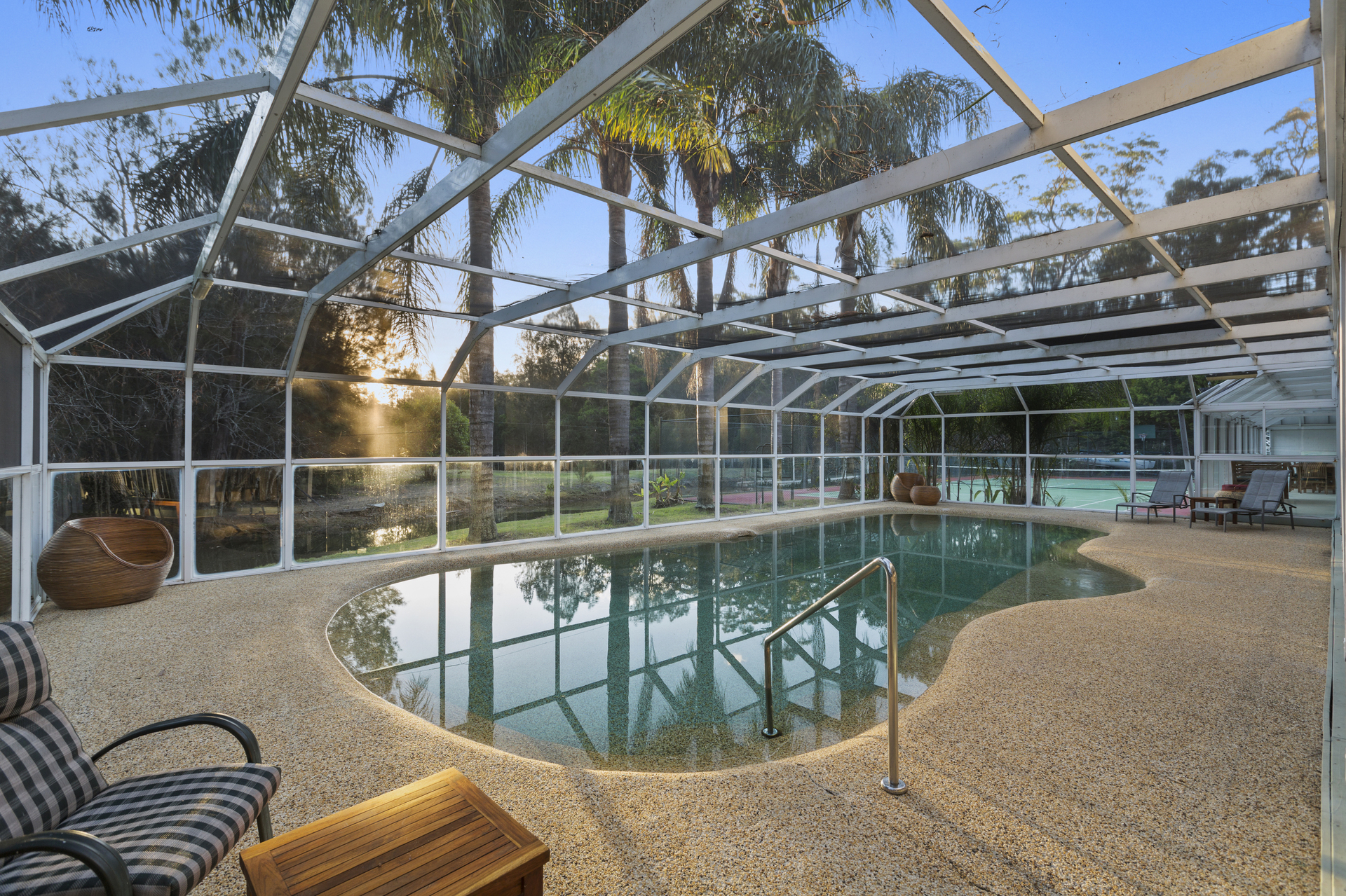 Freeform natural pebble lined large pool with solar heating in a glass and net enclosure.