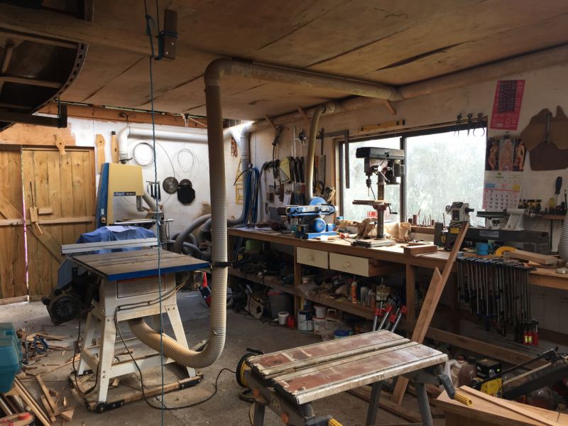 The studio is on a cement floor, with power, currently set up as a Professional woodworking studio