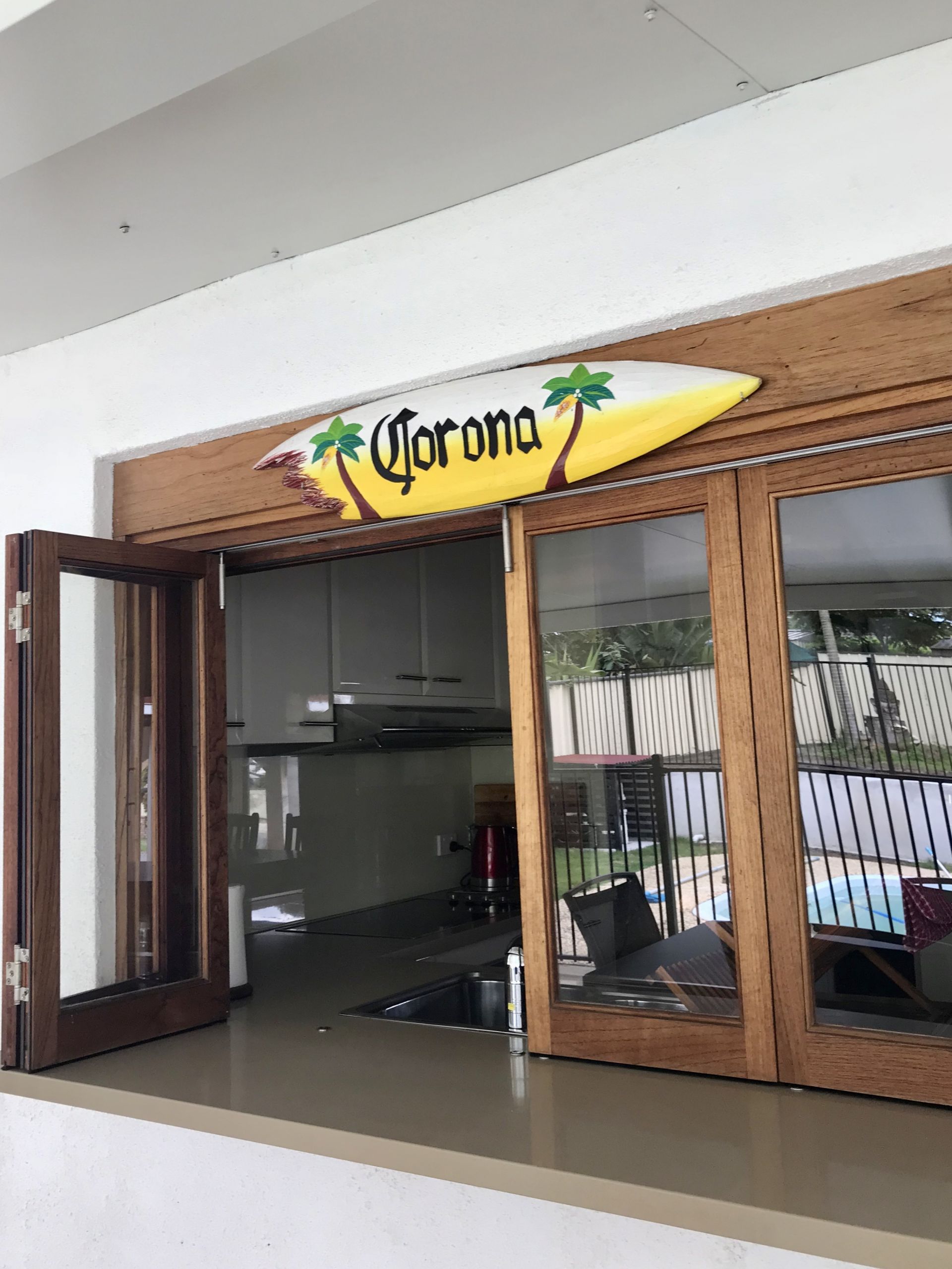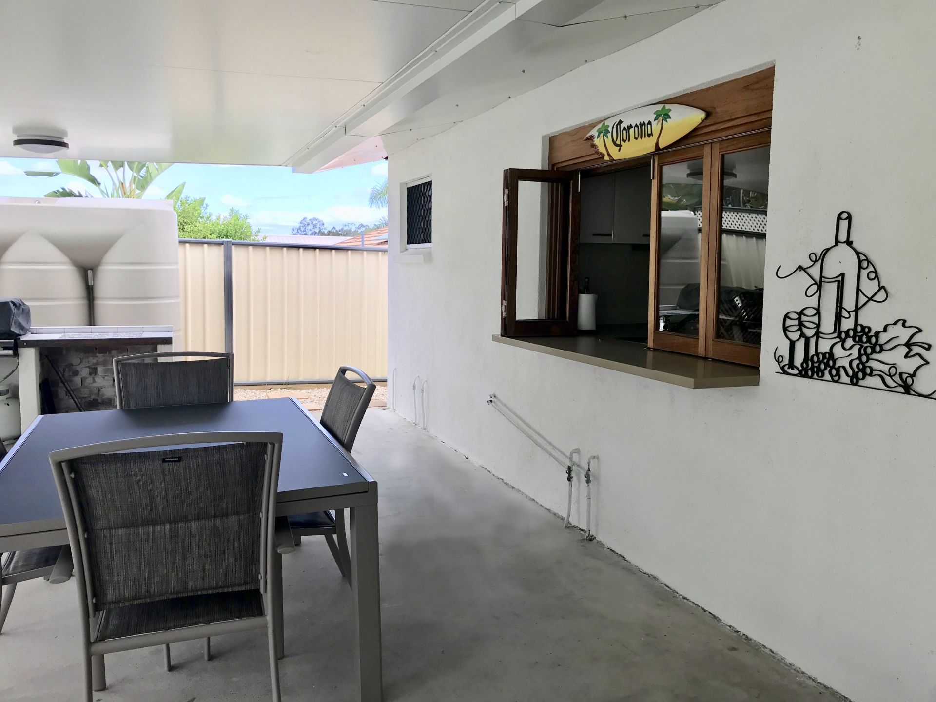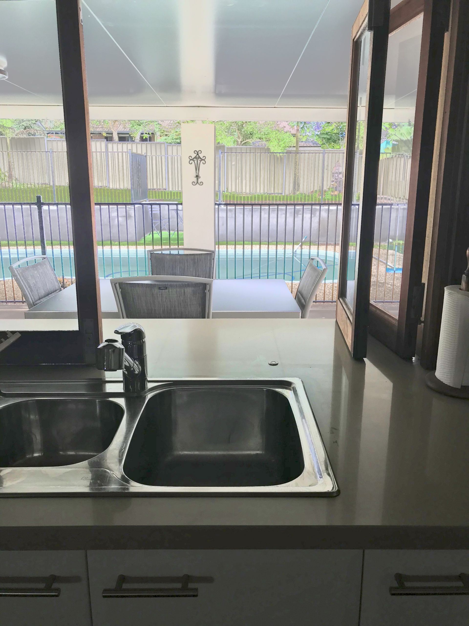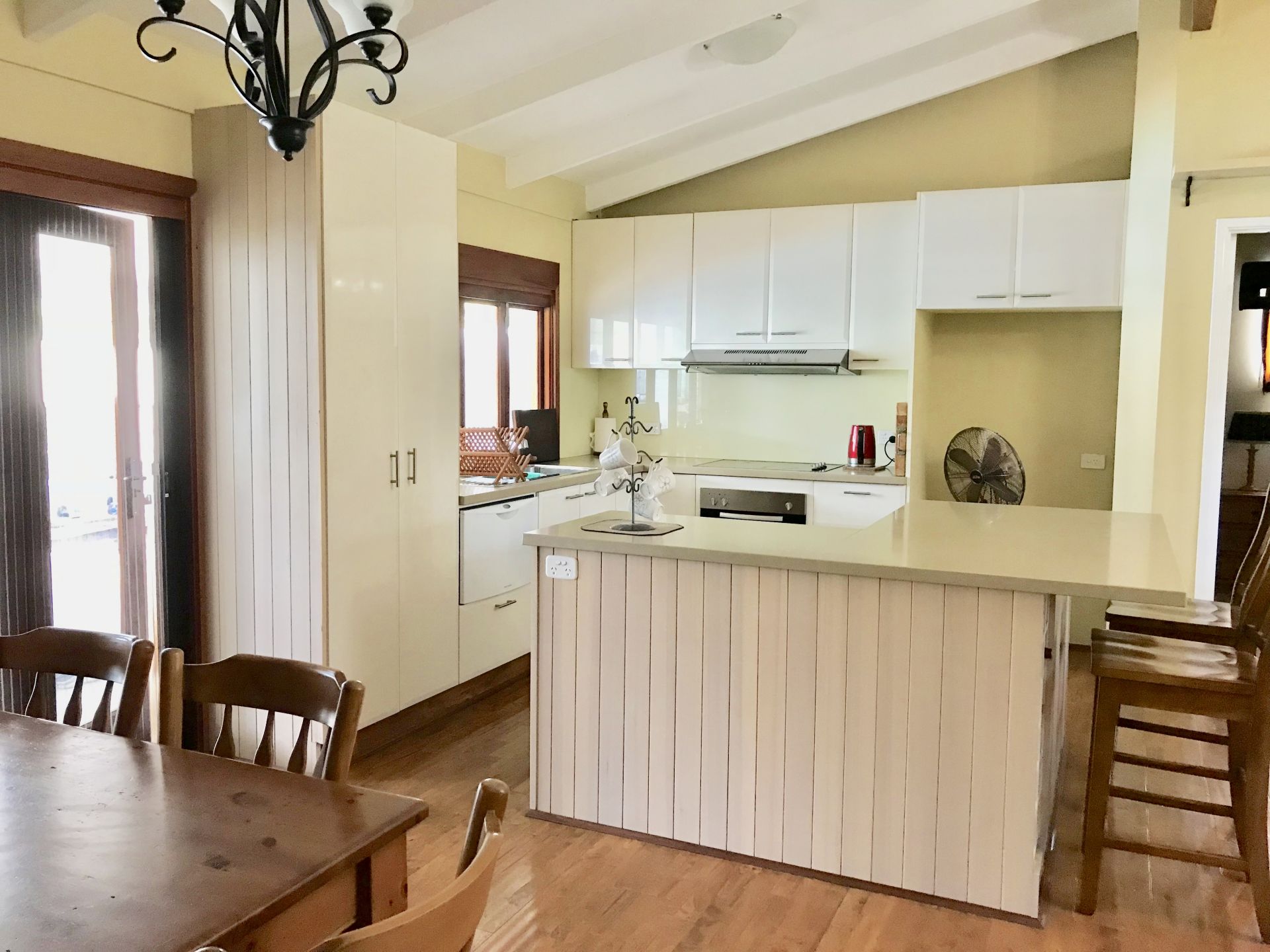 The kitchen is a delight, with stone benches, double sink and servery out to the patio.