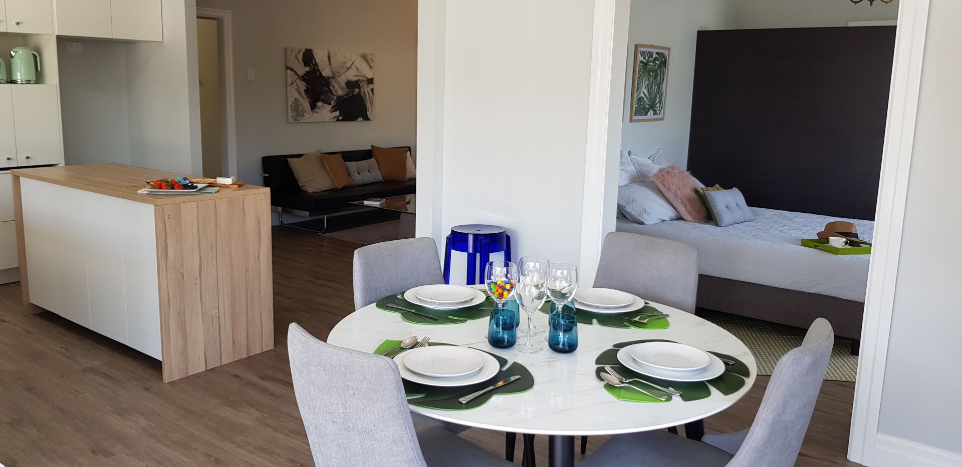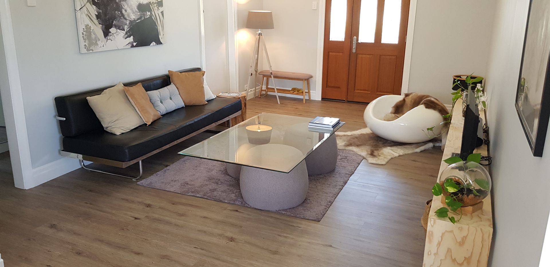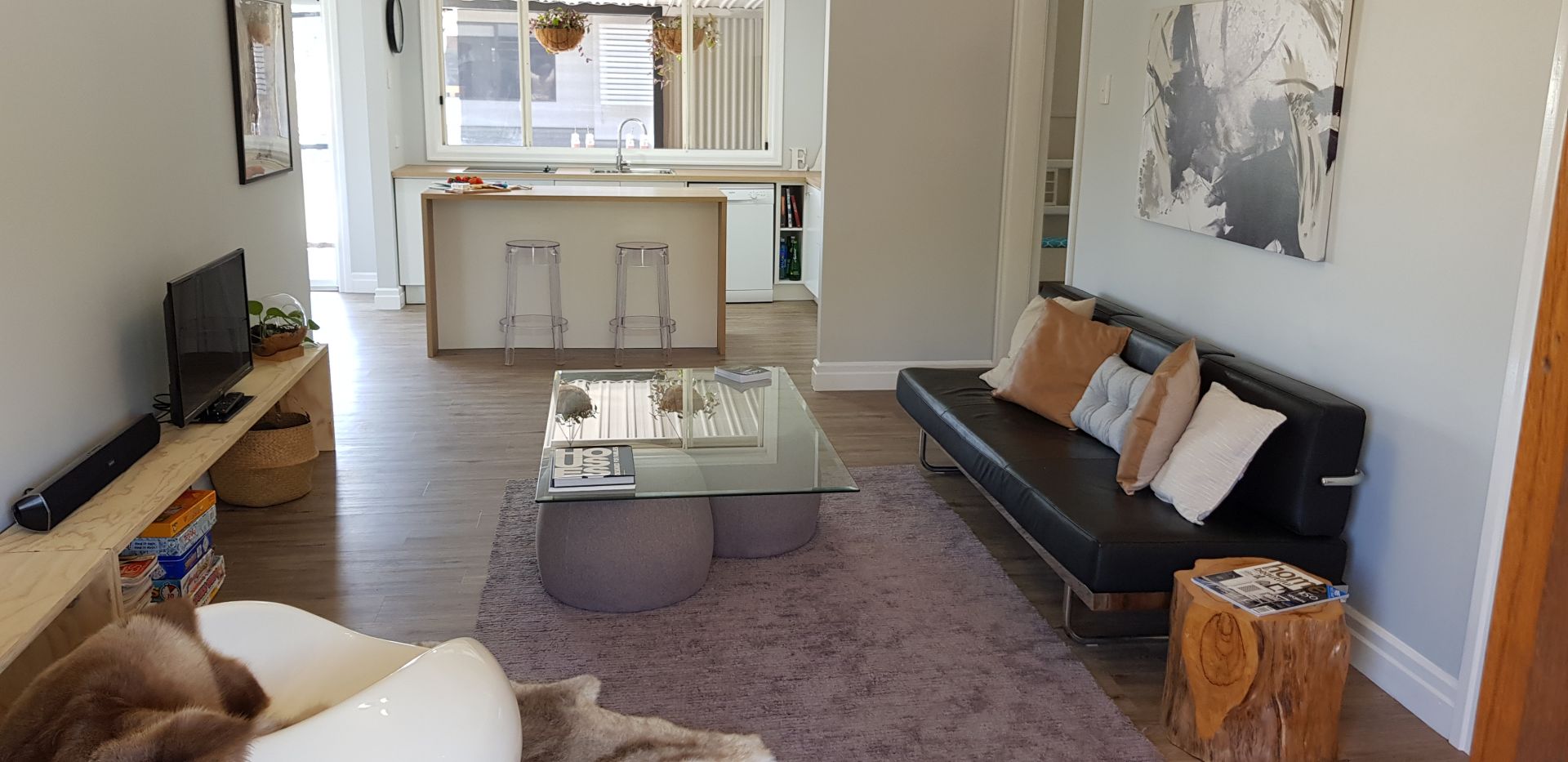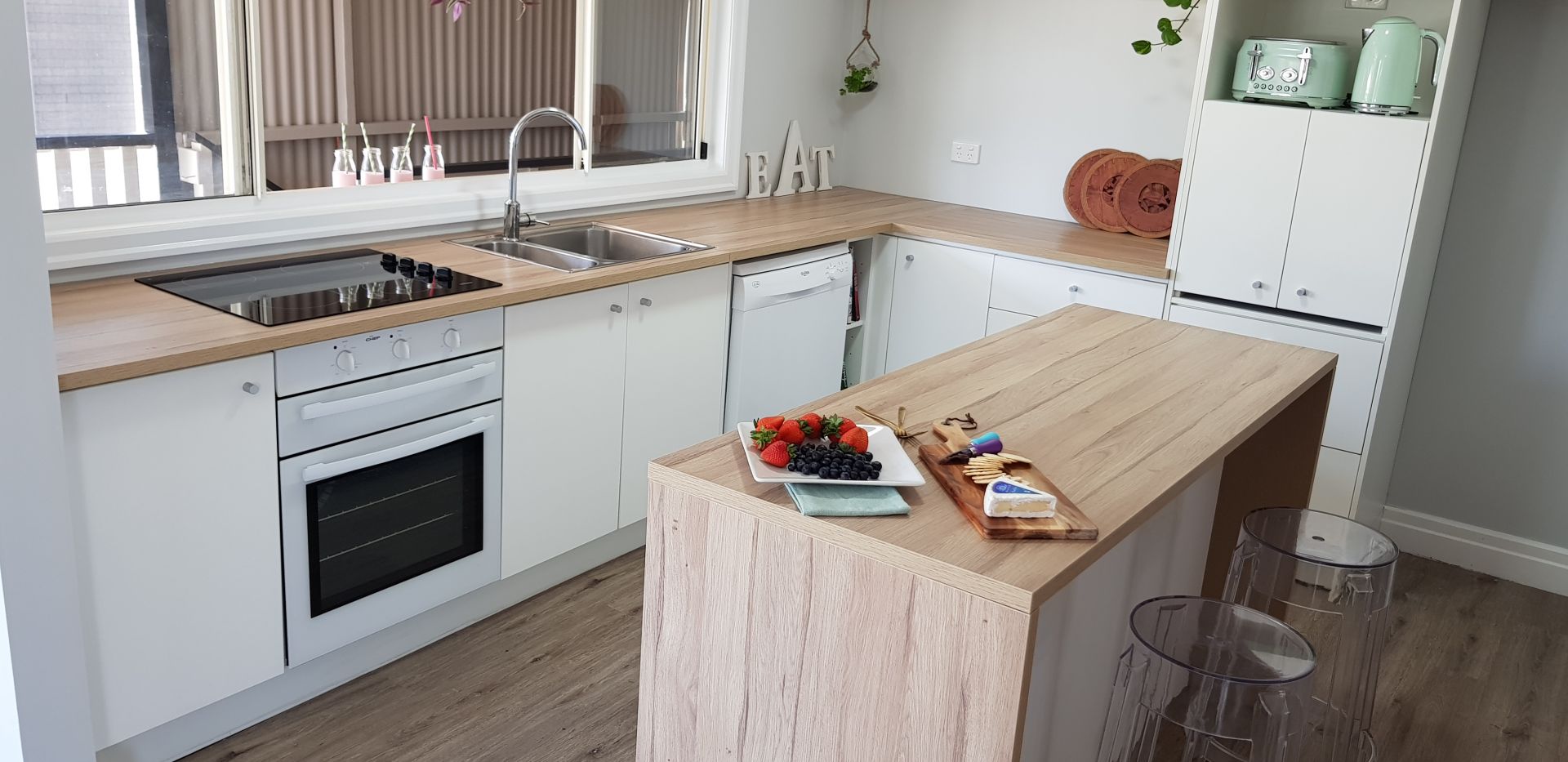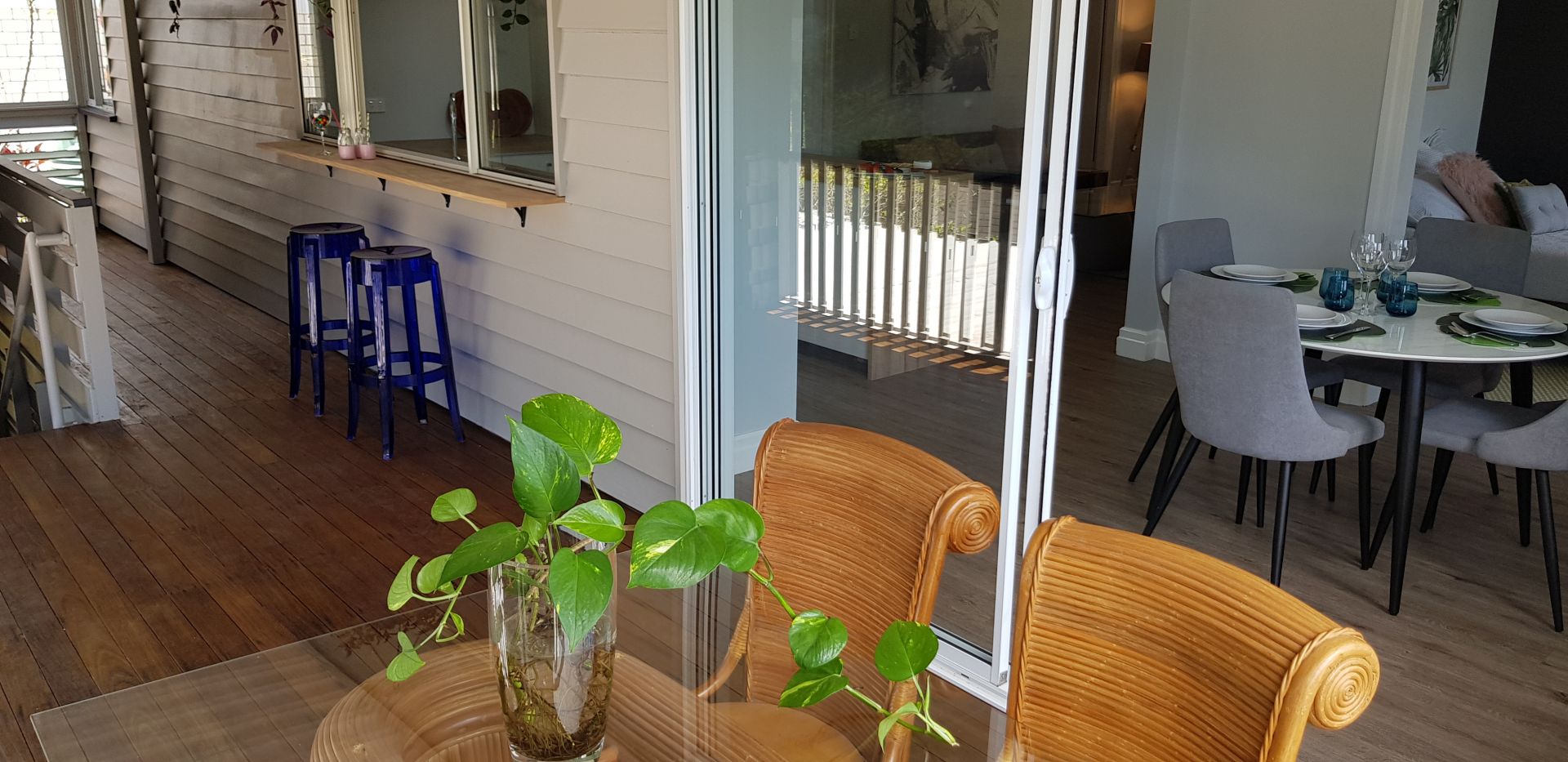 - new kitchen with dishwasher, island bench and servery opening to the rear deck