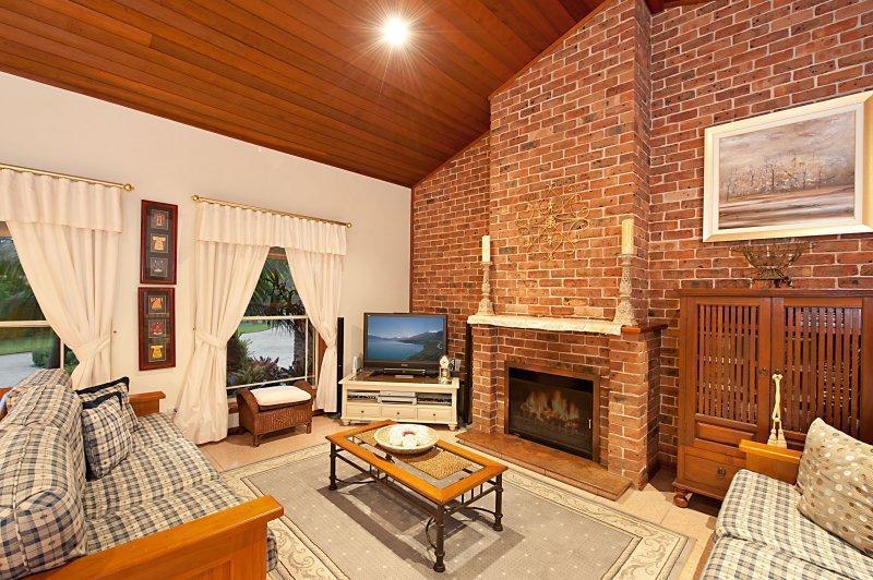 Wood fueled fireplace in Family Room