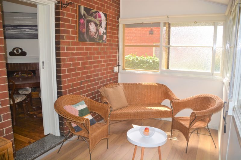 The house has three double bedrooms, separate lounge room, dining area, compact kitchen, modern bathroom, separate toilet and an outside toilet. An enclosed back verandah can be used as a study or sewing room. All windows have security shutters and there is a sun filled front verandah and established garden to bask in the winter sun. The yard is very low maintenance,is level and has a single car lock up garage. Plenty of room to add a carport or another shed.