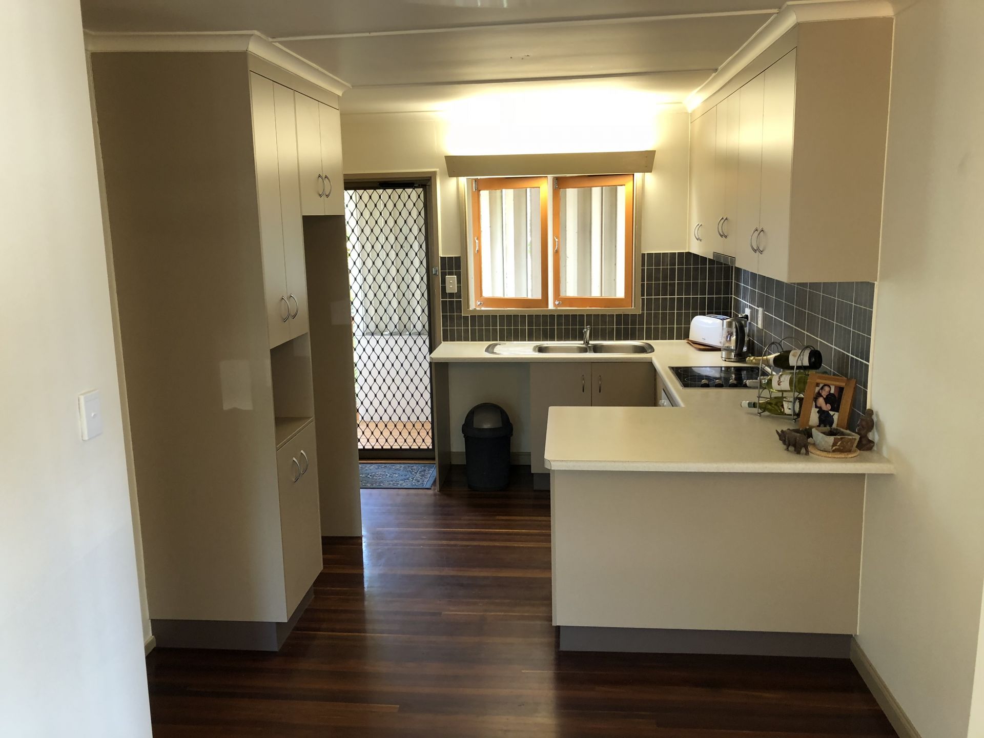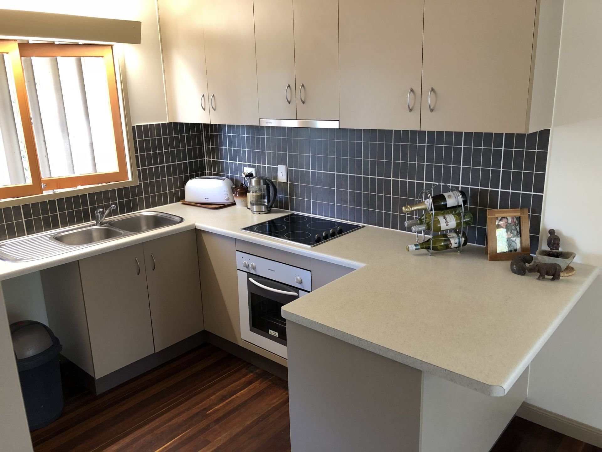 The kitchen has modern cabinets and bench tops, with ample cupboard space.