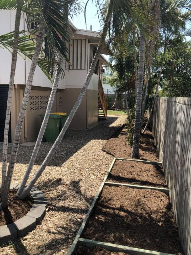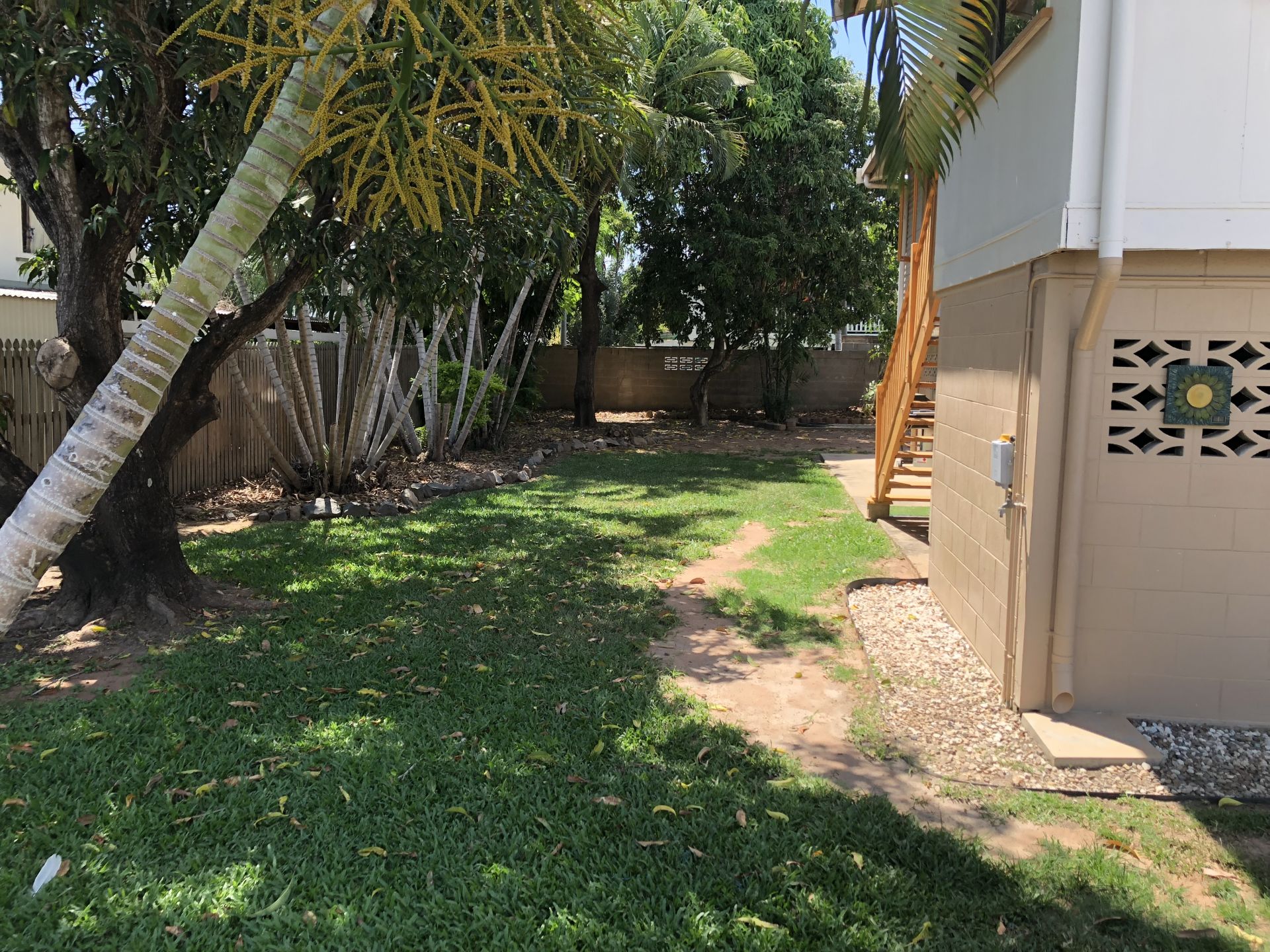 The garden has a lovely grassed area with garden beds, shrubs and trees.