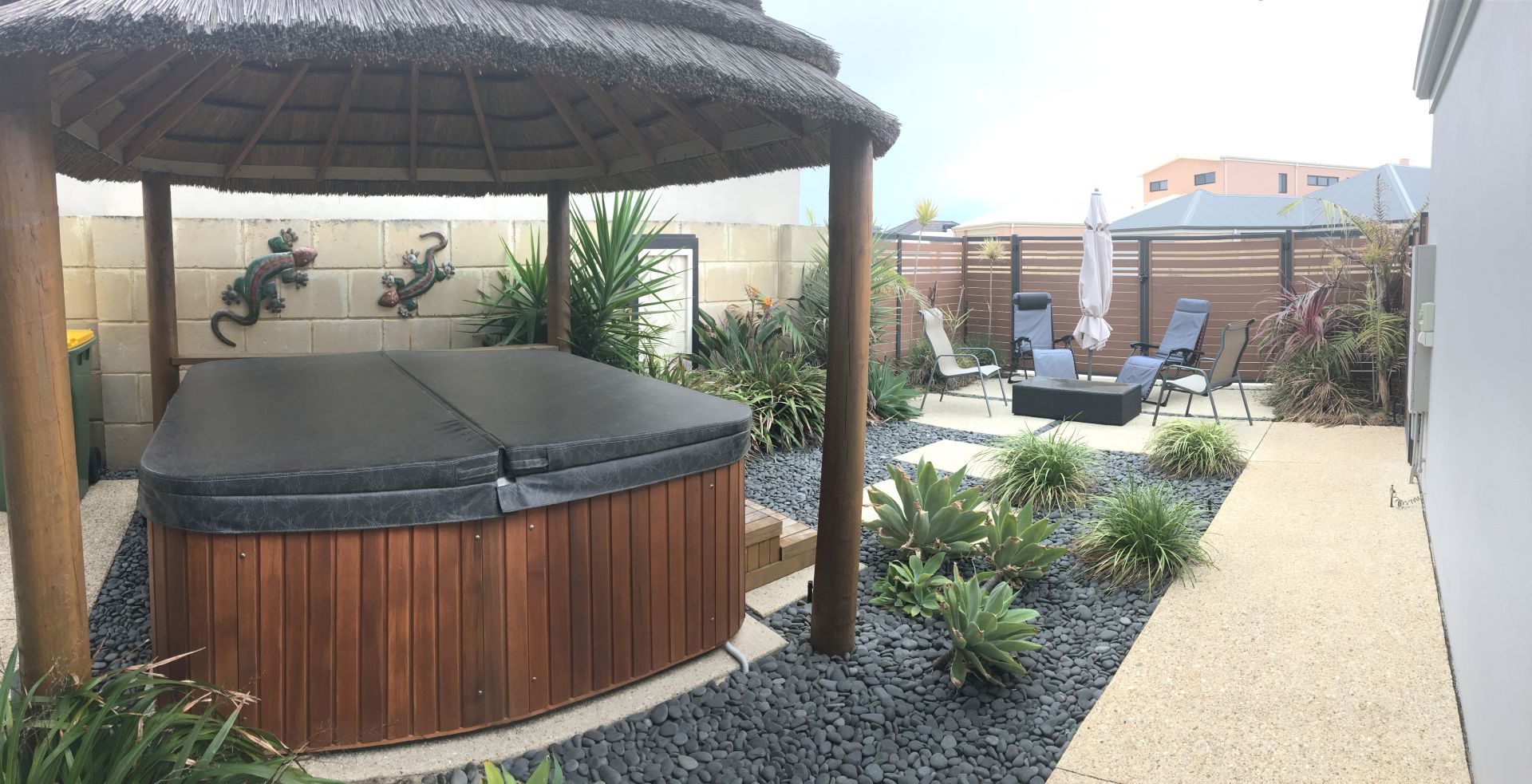 The front garden has had major work and has been enclosed to create a nice private bali inspired retreat with water feature and African thatch gazebo.