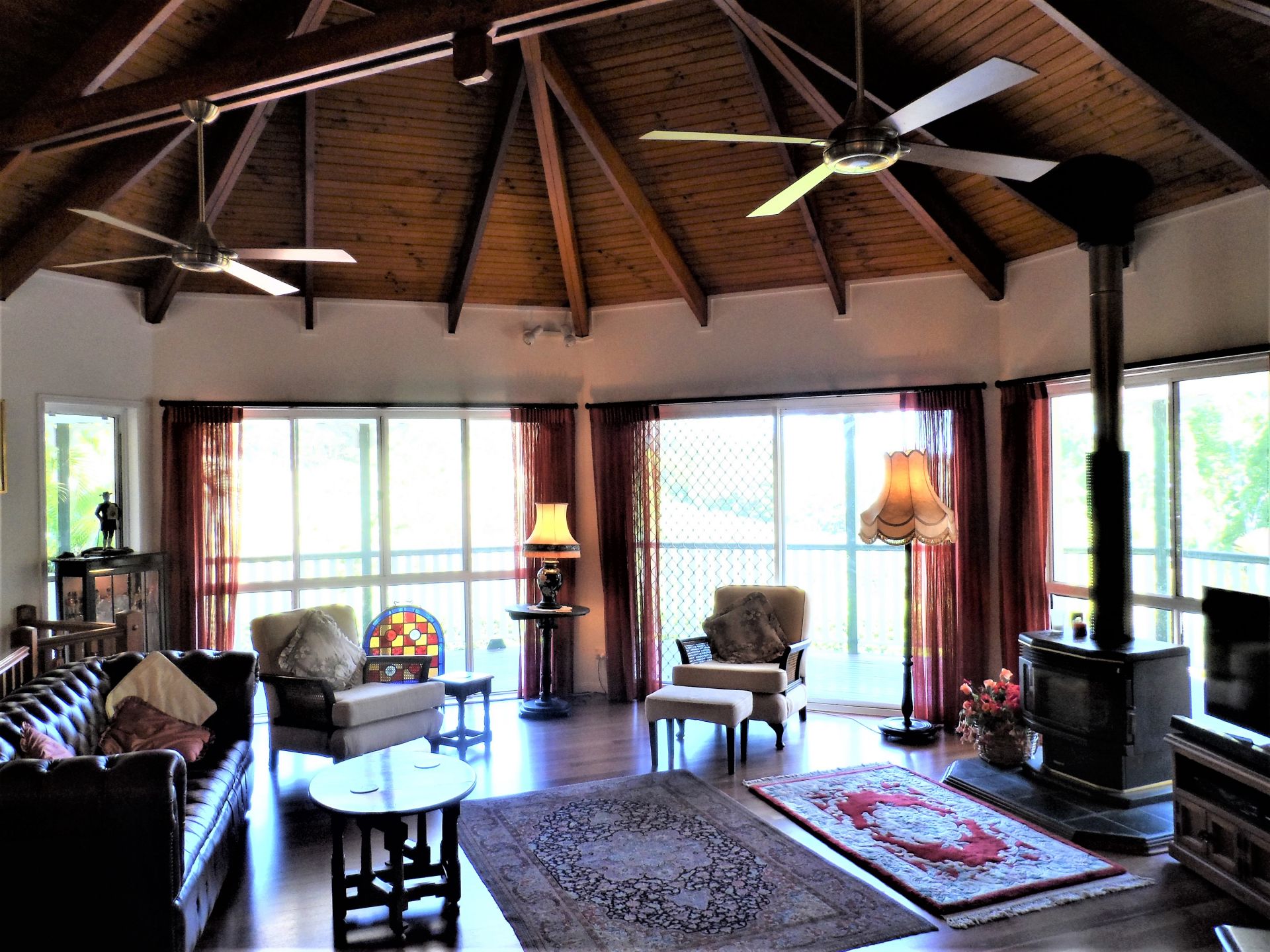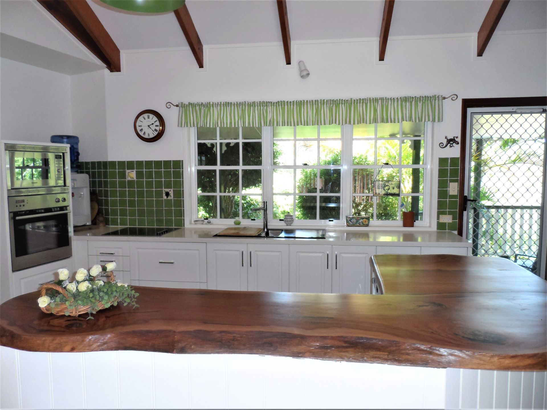 The living area comprises a modern Kitchen with distinctive hardwood bench and modern white units; Dining Area with glazed display cupboard; Lounge with a feature Cathedral ceiling and natural timber flooring, wood-burner and reverse cycle air conditioner.