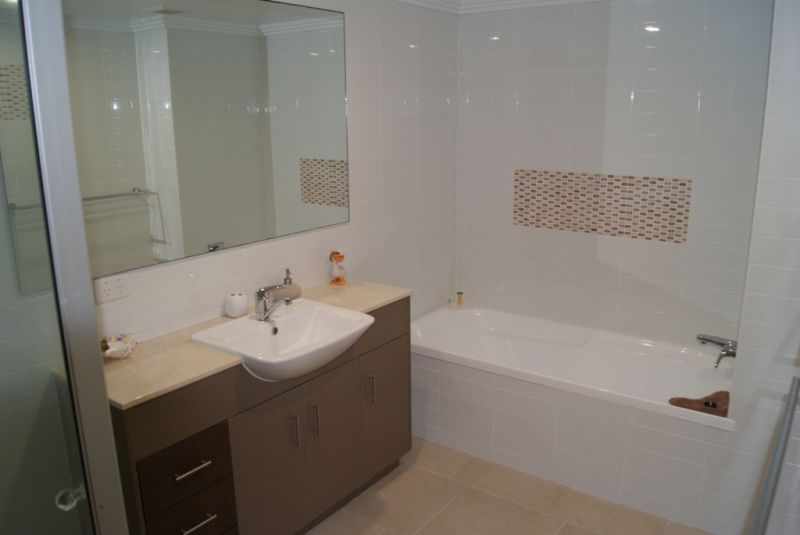 - Both bathrooms have floor to ceiling tiles, stone tops