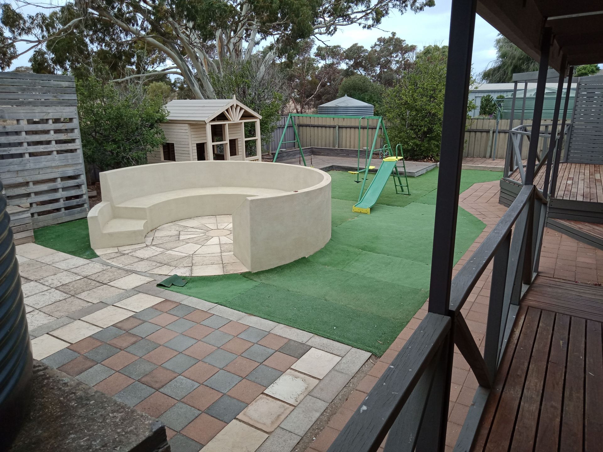 The back yard is great for kids with timber cubby house, sand pit, slide and swing set on synthetic grass. Entertainment decking area for kids alongside. A separate area for pets and all safe with locked gate.