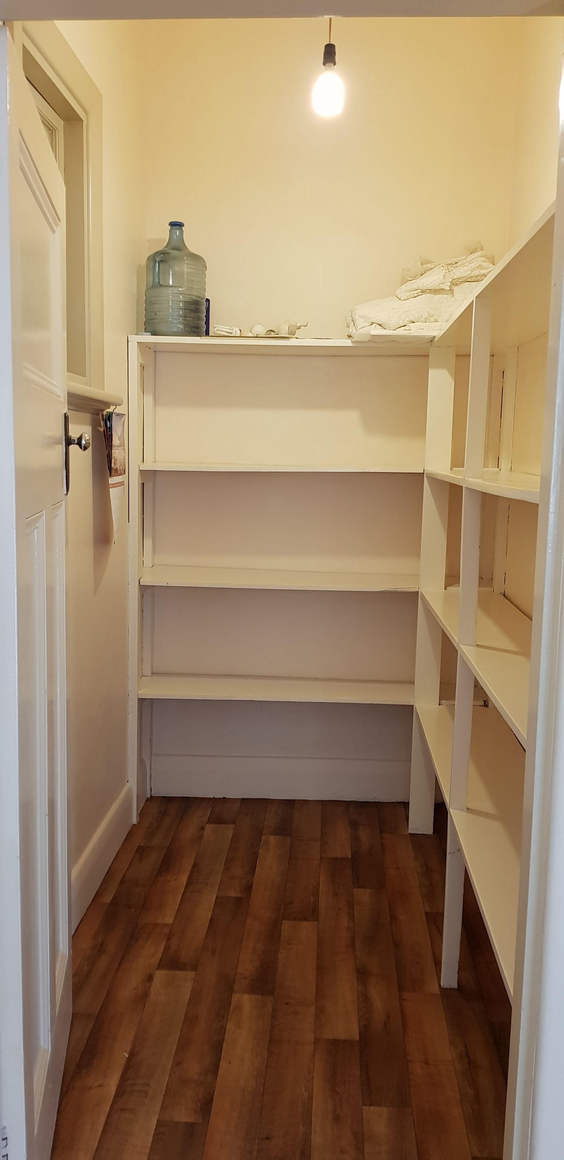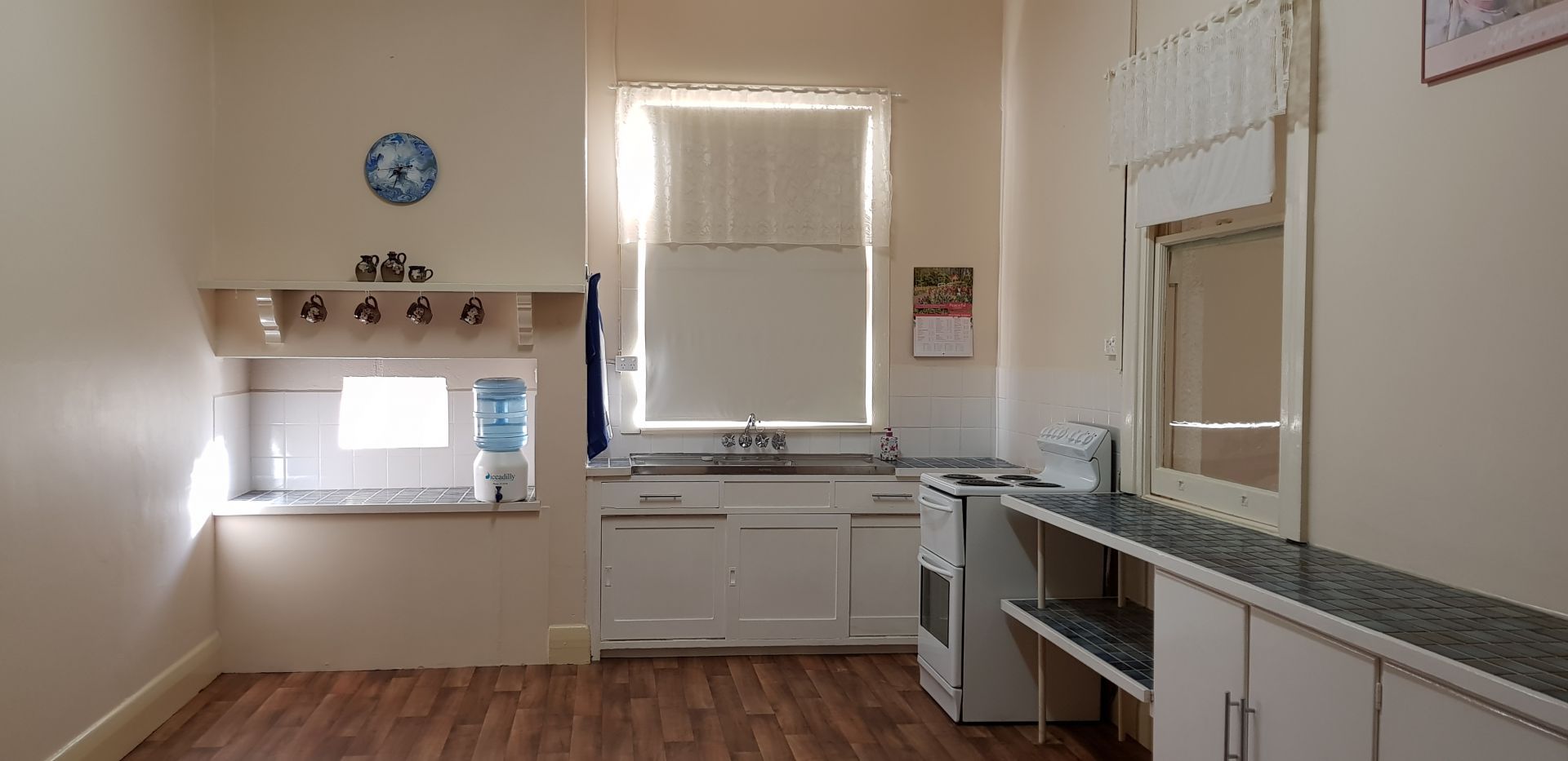 The kitchen is spacious with new flooring and features a large walk in pantry.