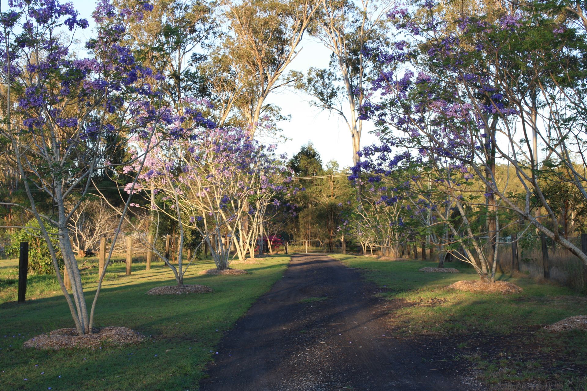 • Long jacaranda-lined driveway