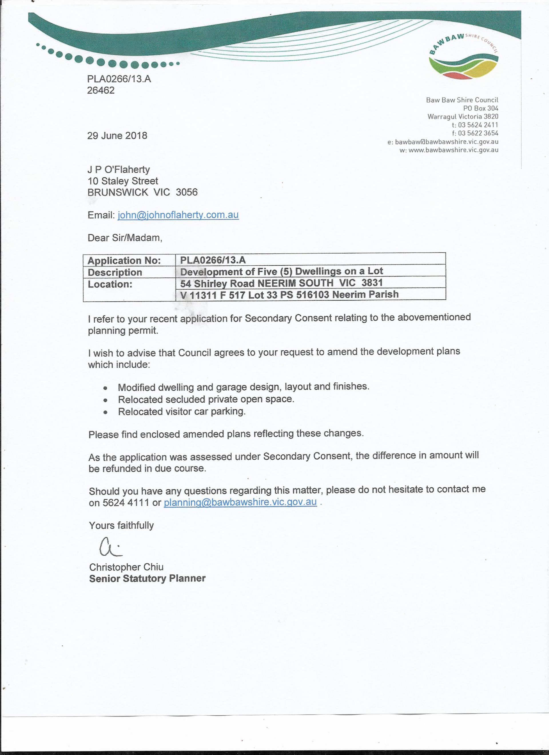 Proposed Plan of Subdivision, Survey and Building Permit fees for Unit 1 have all been paid, as well as all other fees as requested by Council. A landscape plan has to be amended, we can do this if required or you can design what you like and have it done elsewhere.