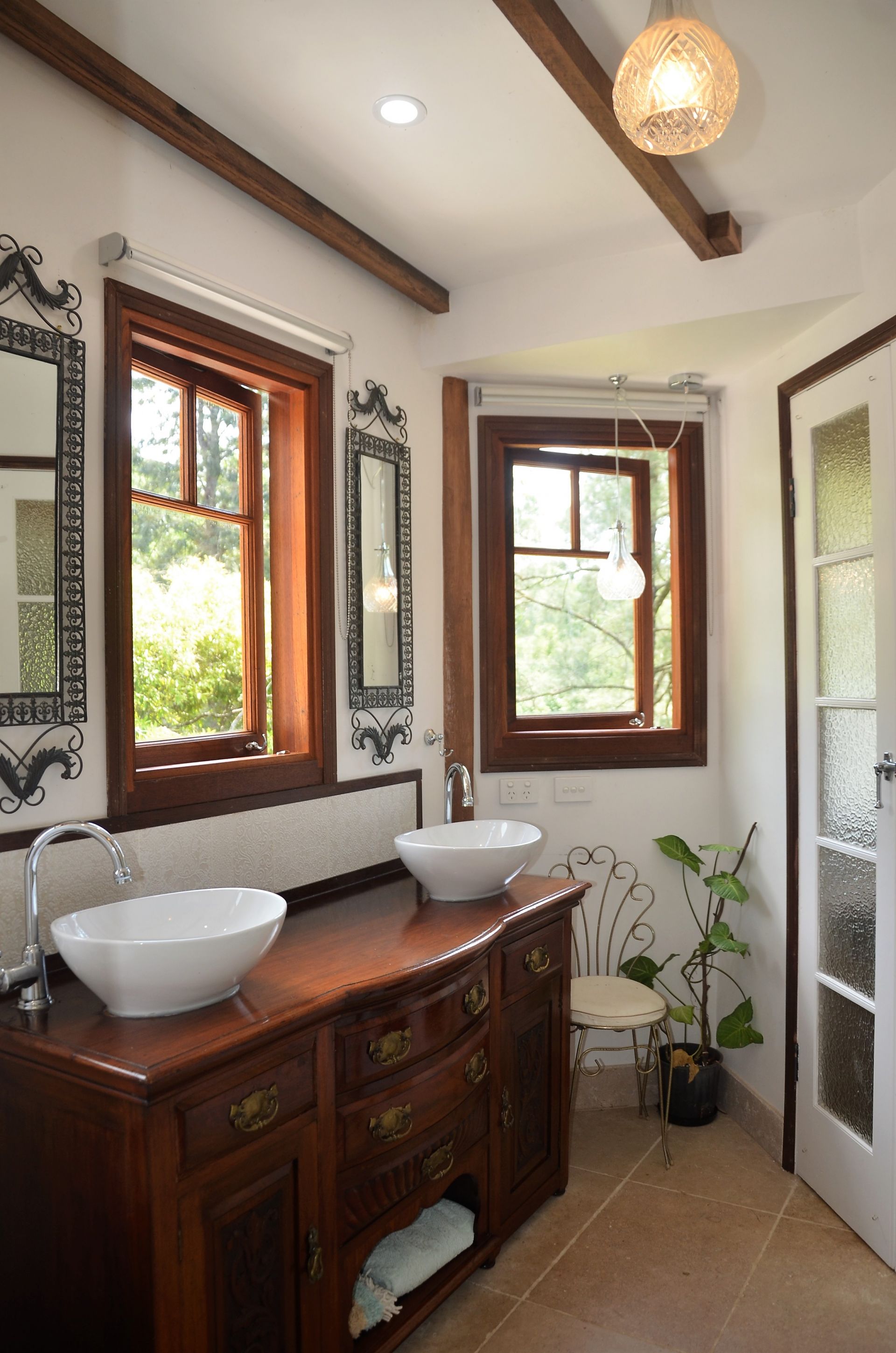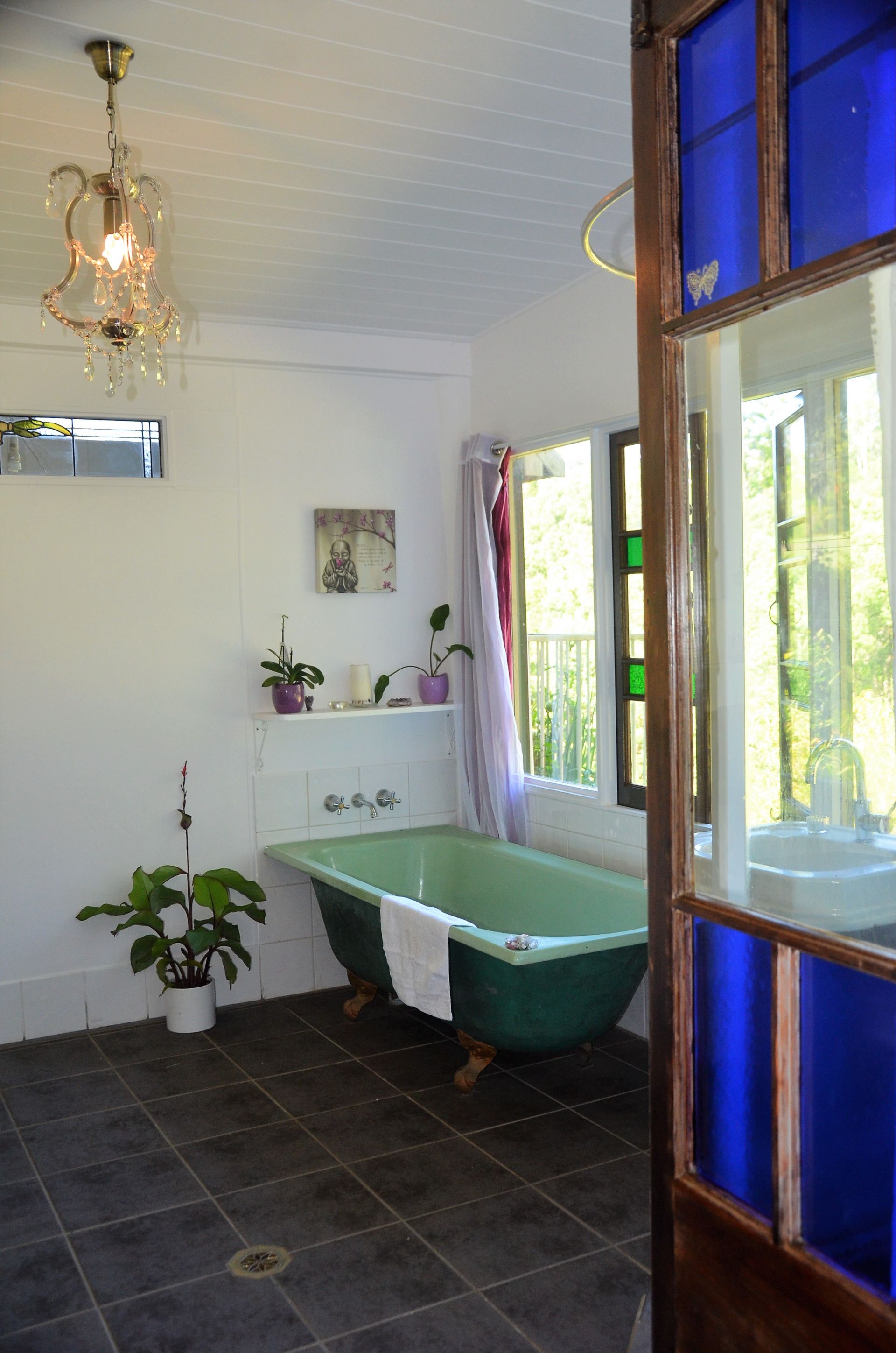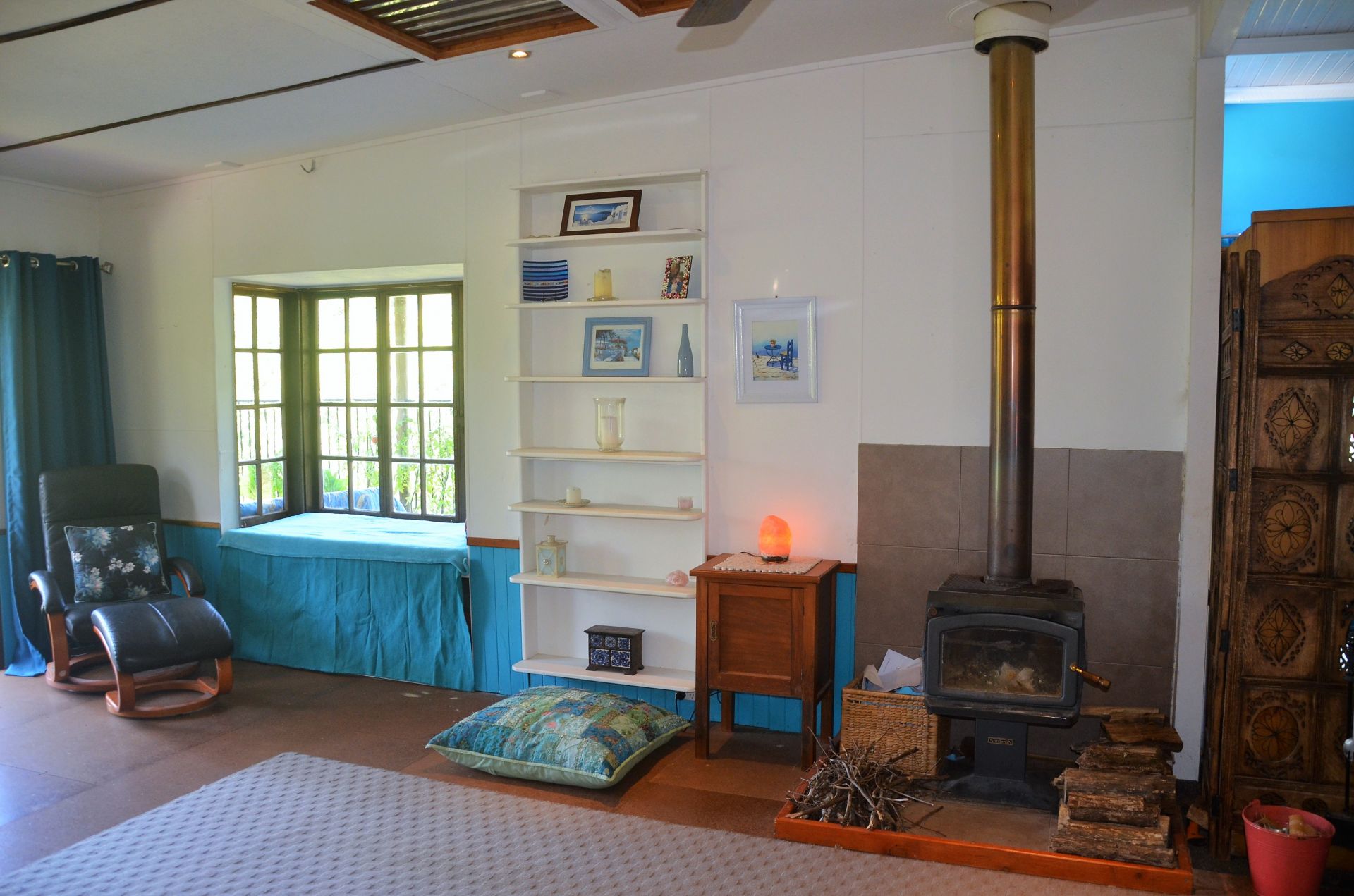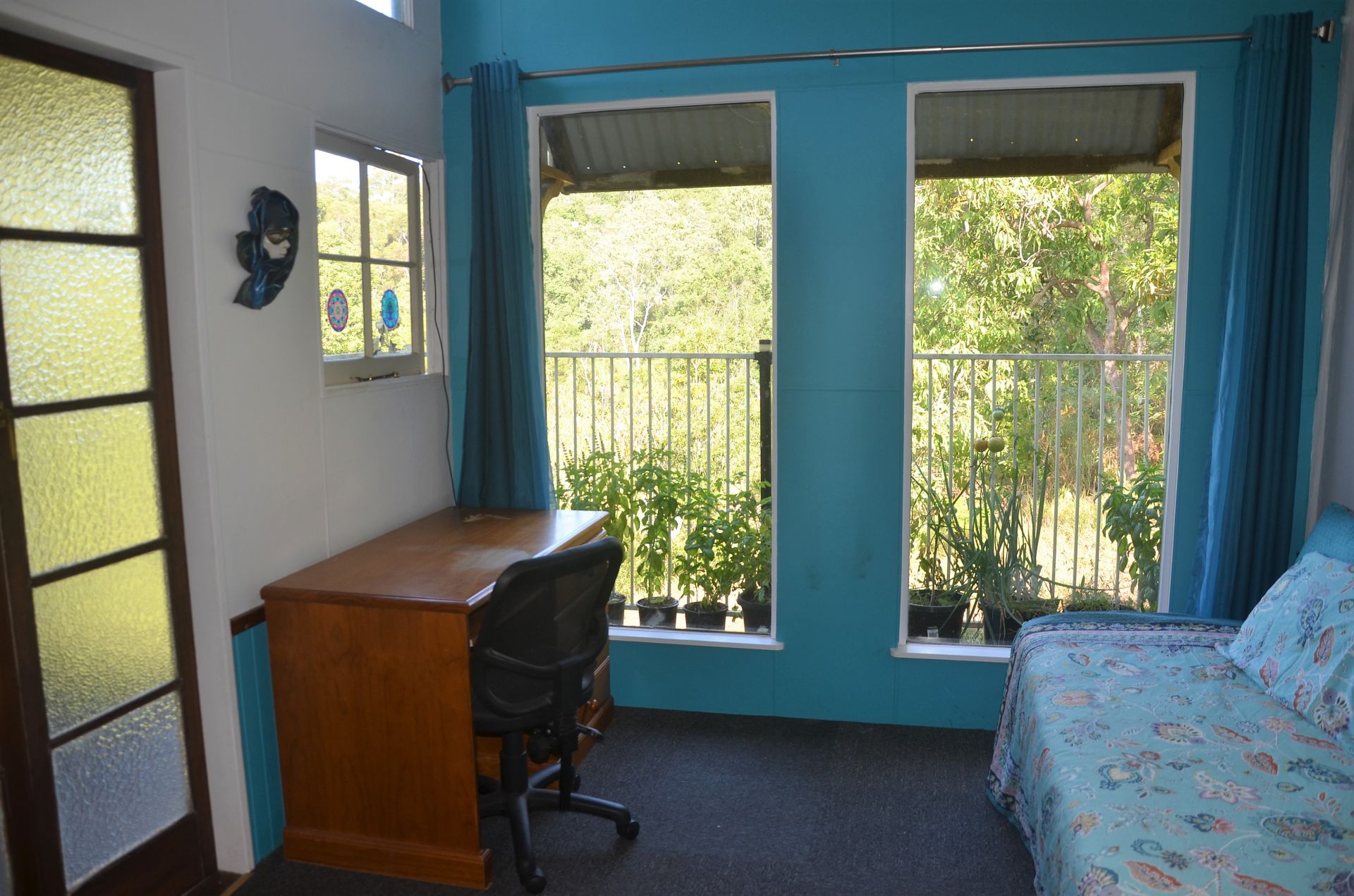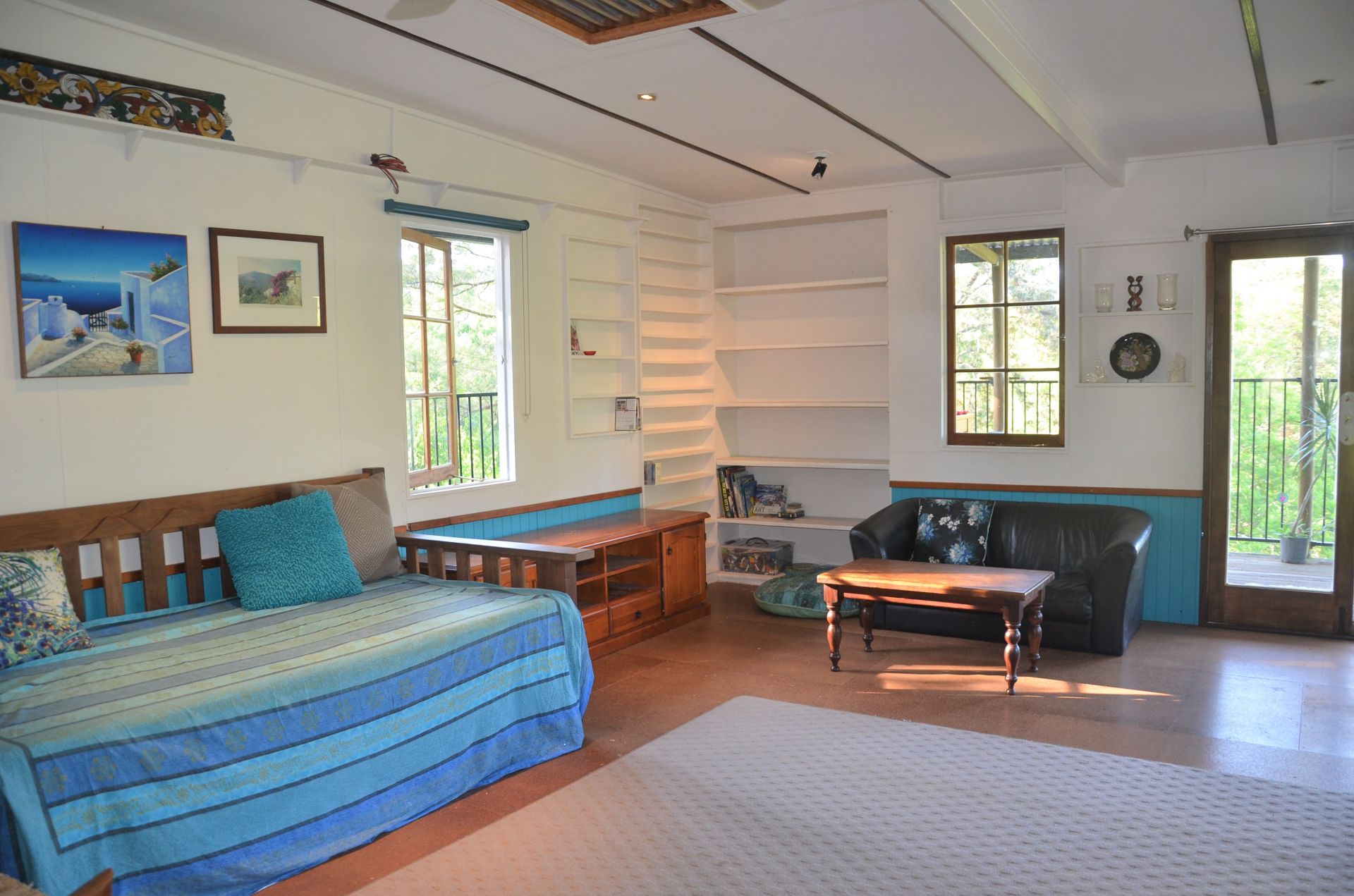 Master bedroom features lovely views, BIR and huge en suite with iron bath, pedestal basin and large windows bringing in the views of Blue Knob. 3 bedrooms are in the 'Children's Wing' along with laundry, separate toilet, shower and basin. Adjoining this and the living areas is the new main bathroom fitted with fossilised Limestone tiles, Antique double vanity unit, cedar windows and silky oak french doors, toilet and rainwater showerhead and views to border ranges. 5th bedroom or 3rd living area is off living area and has access to deck and stairs leading down to the separate meditation room or 5th bedroom