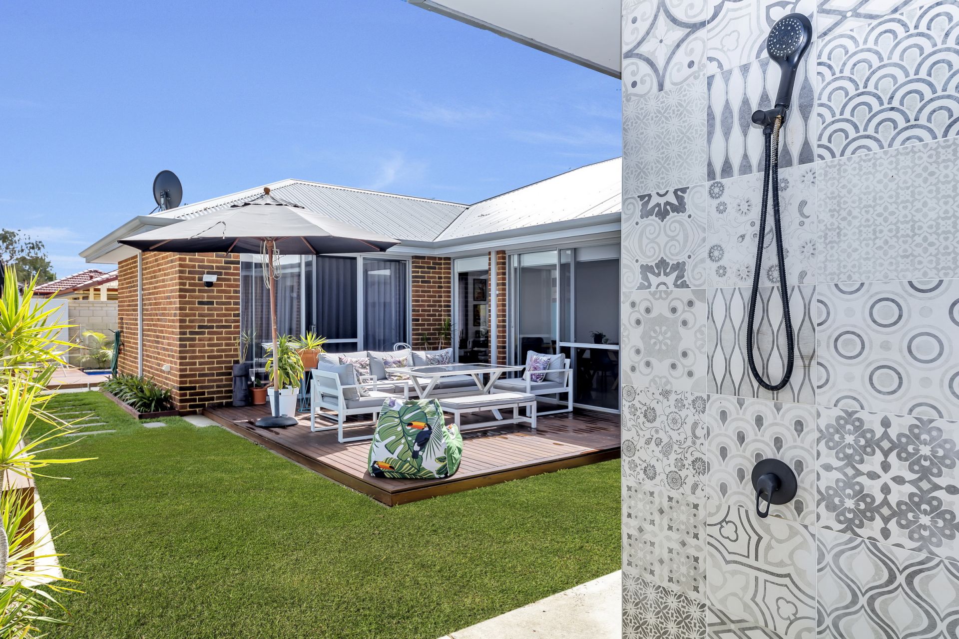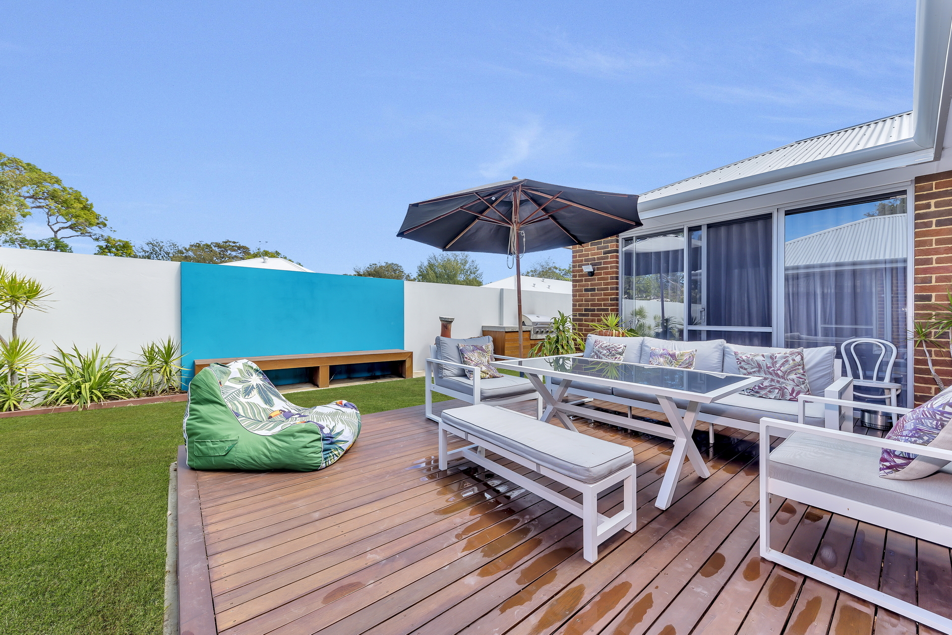 The front yard has a lovely native and palm landscape built around hard wood decking and vintage wooden sleepers. Featuring a play area for kids of all ages.