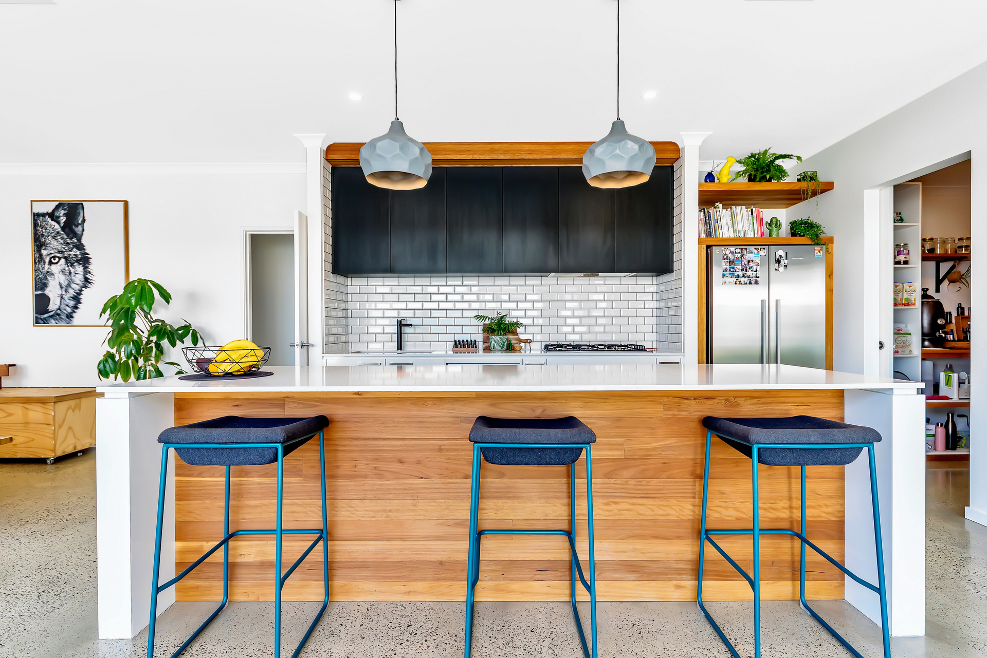 Polished designer concrete flooring throughout.