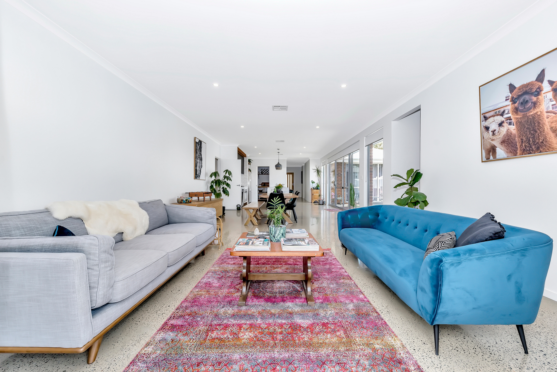 The living area rolls into the dining and kitchen and has access to the outdoors with high glass sliders and windows.