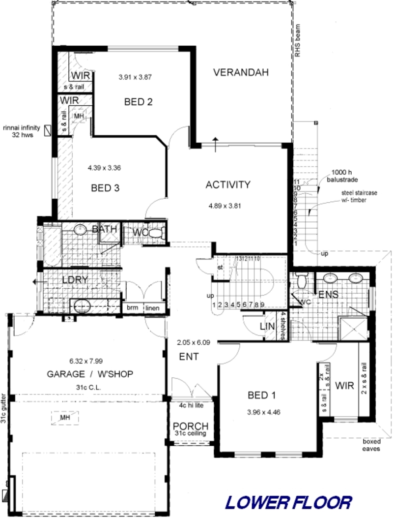 * Master Bedroom with private Double Ensuite and huge walk-in robe, 2 more large Bedrooms with built-in robes, Activity Lounge, 31c high ceilings, Bathroom, WC and big Laundry with overhead cupboards plus extra large double garage and workshop all downstairs.