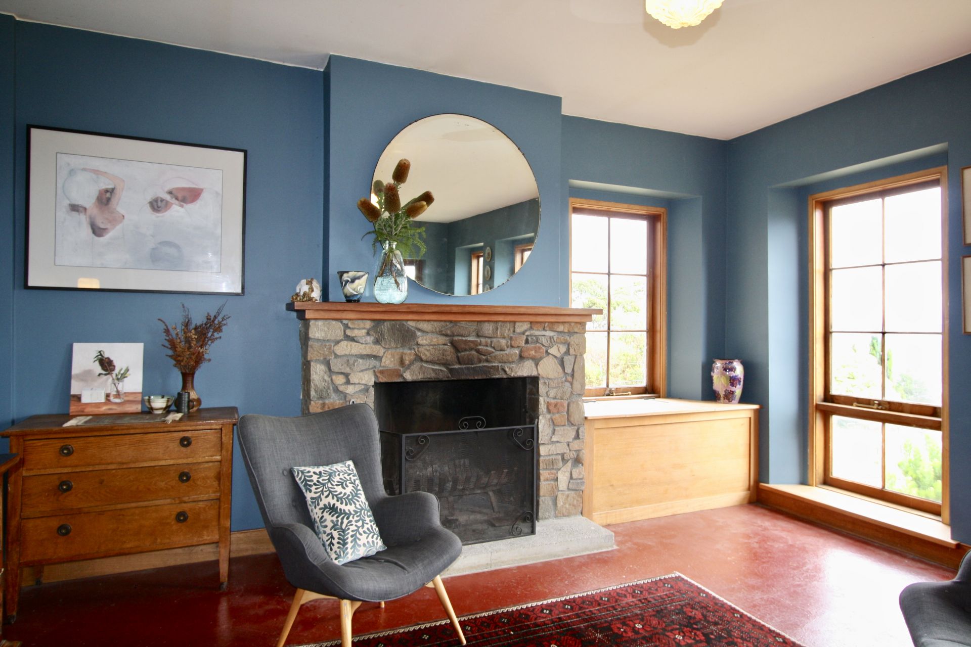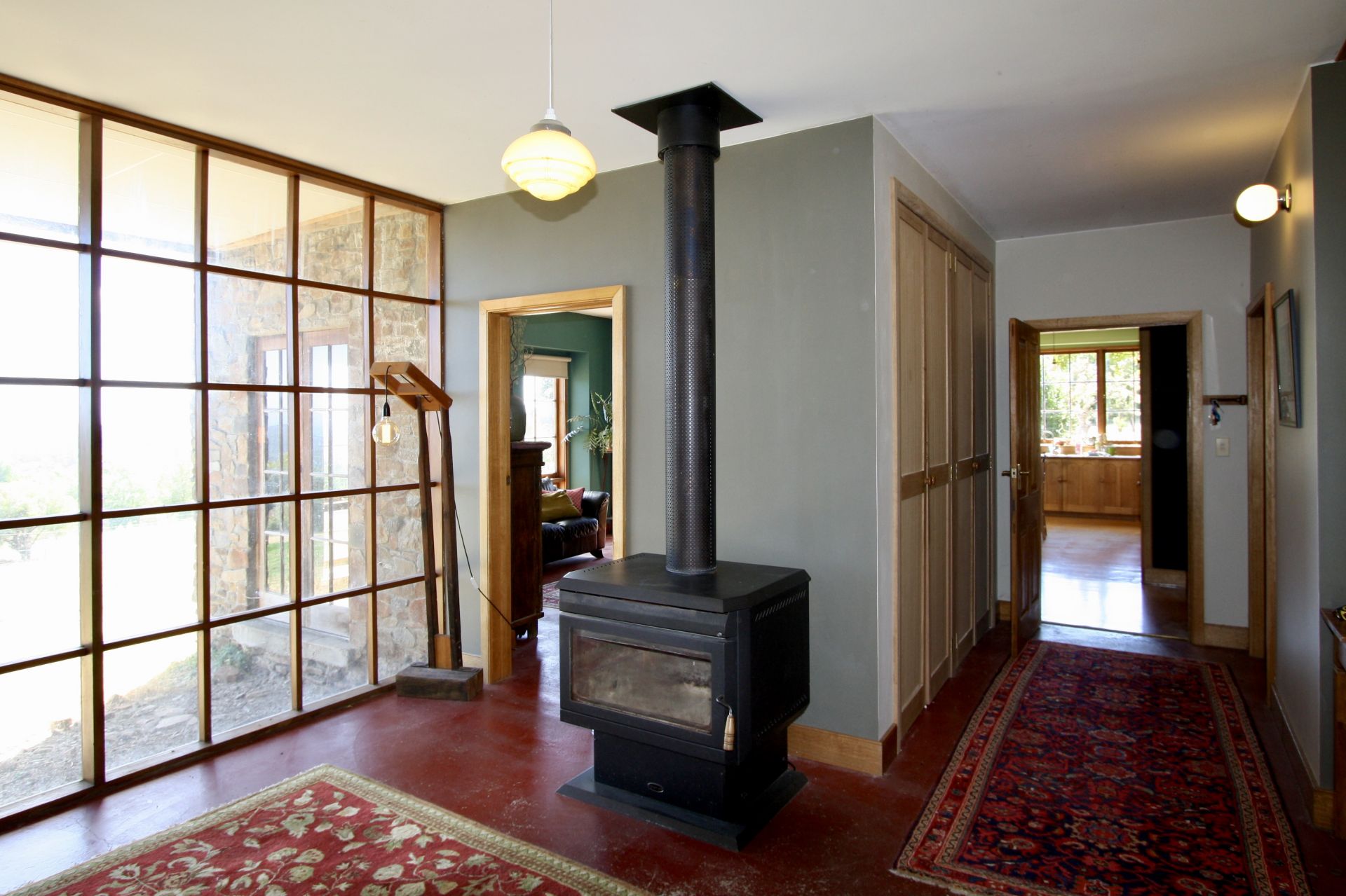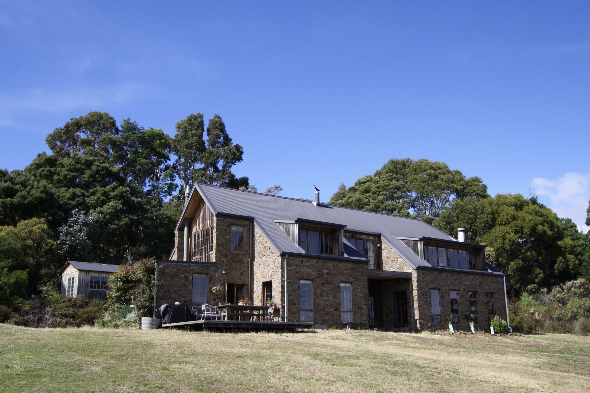 The unique home is built of local stone and is situated to ensure views from every window. There are 5 bedrooms, some very generously proportioned. The eat-in country style kitchen boasts a Rayburn wood fired stove with a "wet-back" that provides the house with hot water, keeping power bills to a minimum. There is also a slow combustion heater which heats the whole home, with the stone walls providing excellent thermal properties. Living areas consist of a large Living/Dining room with an open fireplace, a Lounge Room that opens onto the deck (and those views), and an extra informal living area upstairs. There are two bathrooms, one with a claw-foot bath. The northerly aspect means the home is full of natural light.
