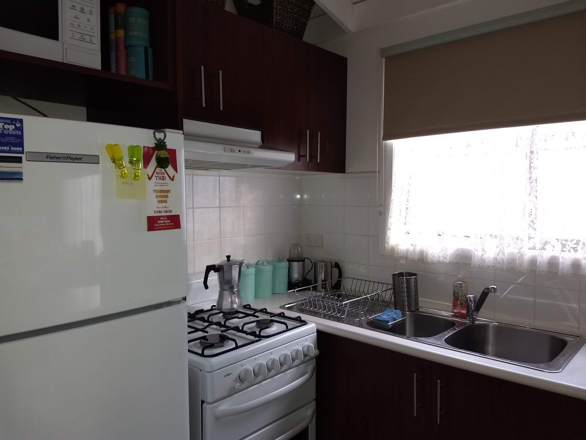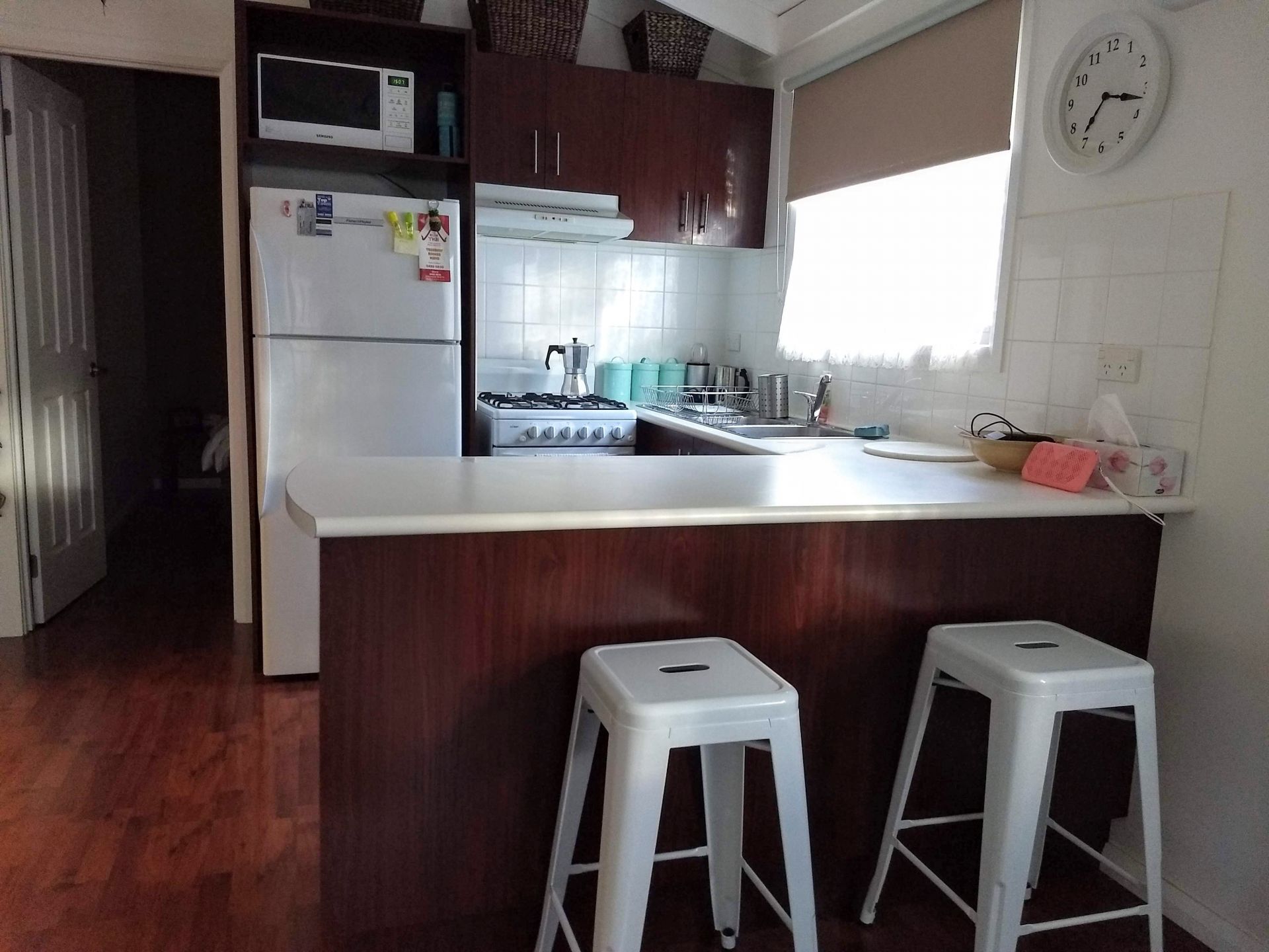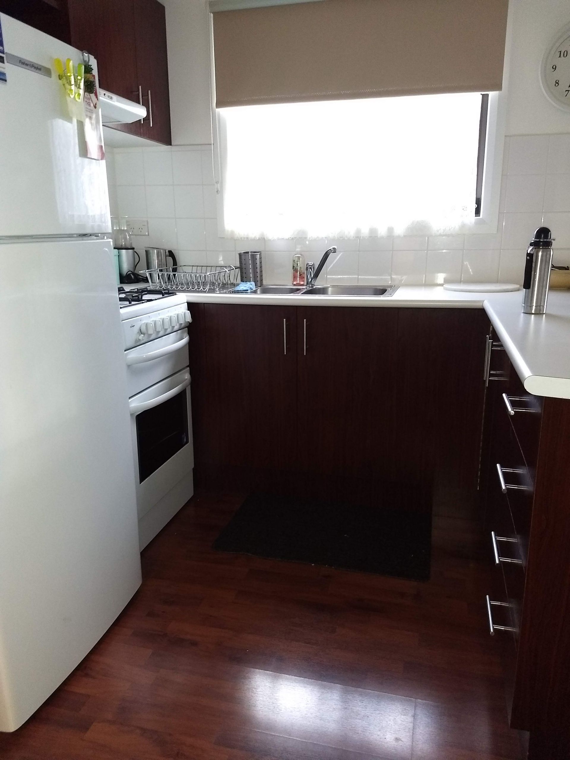 Neat and clean kitchen with fridge, gas cooking and microwave. Plenty of kitchen storage
