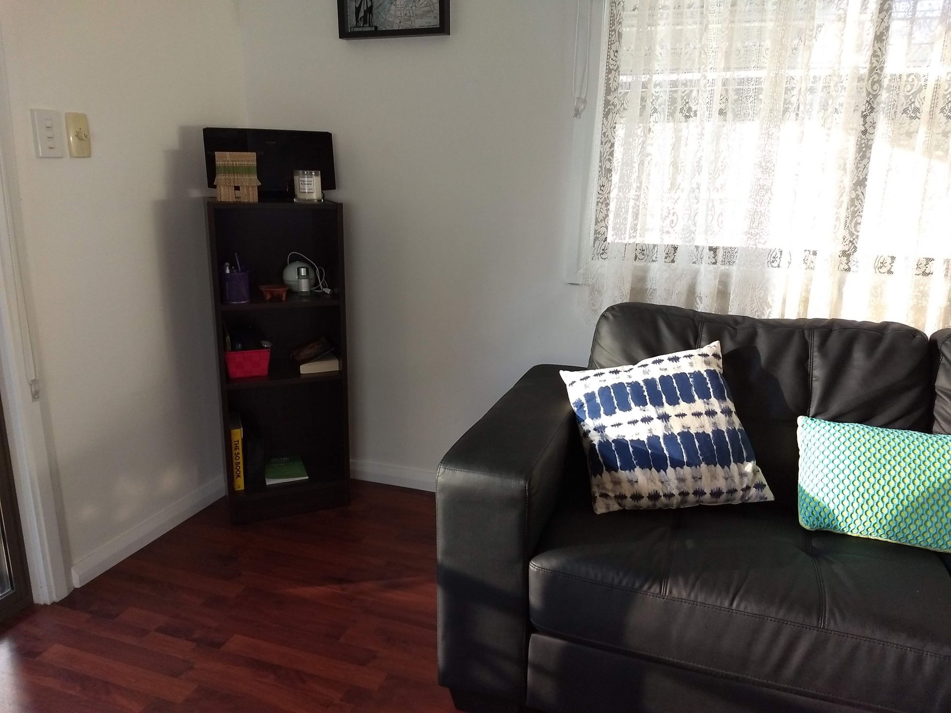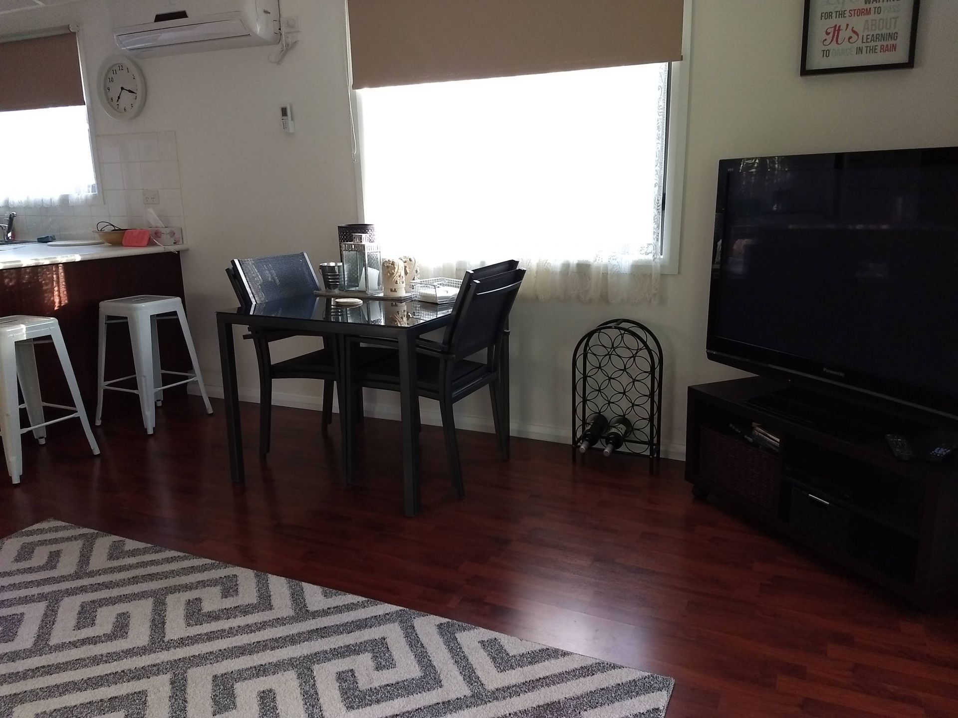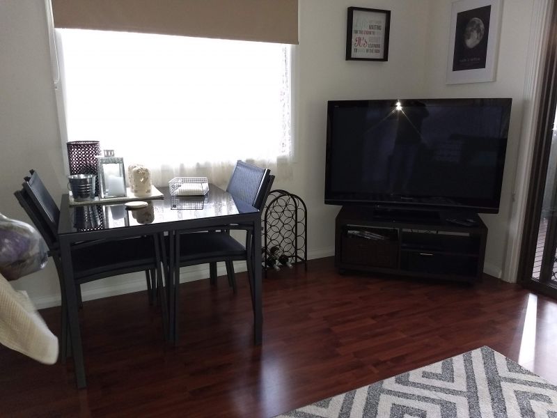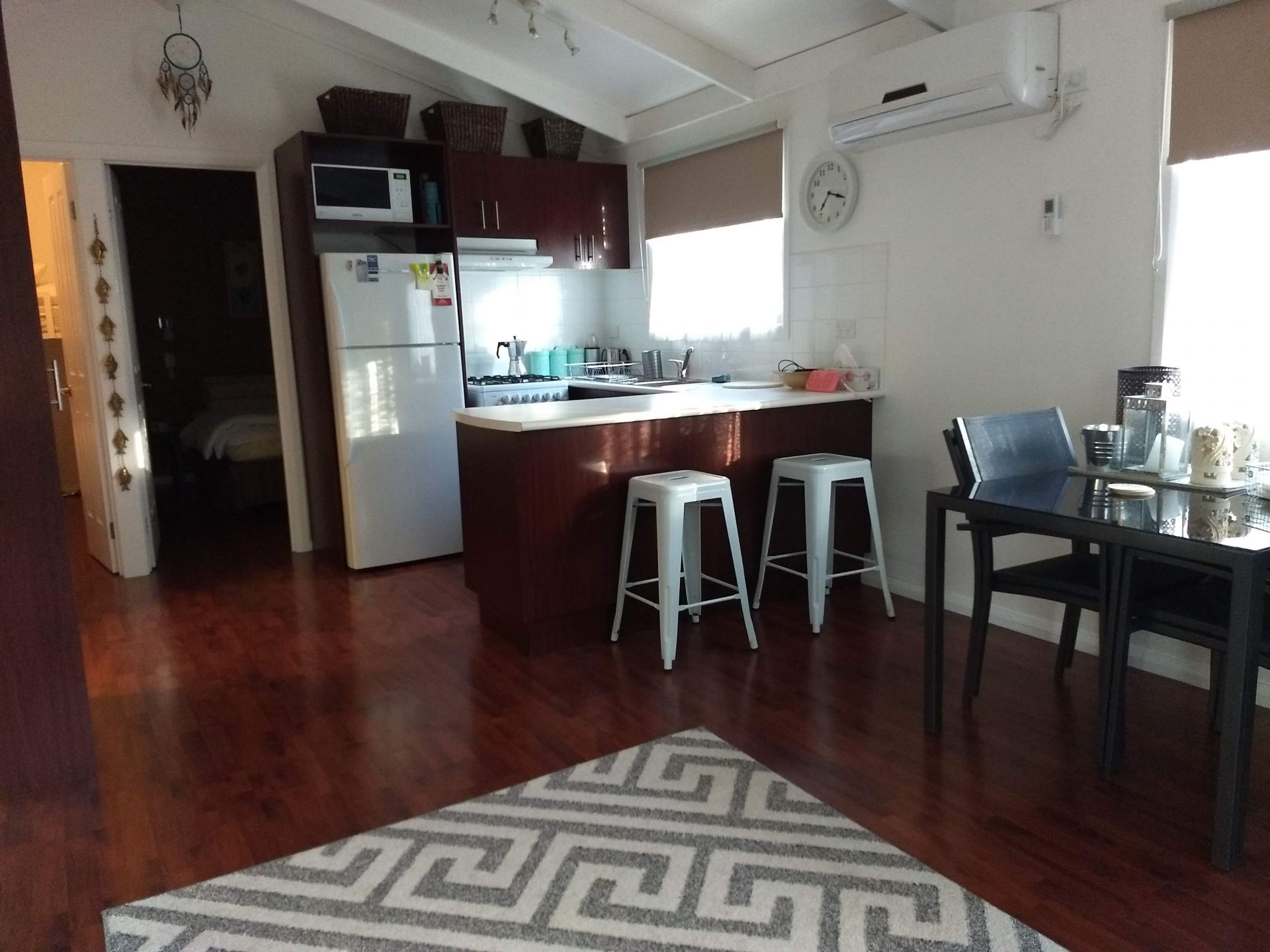 Neat and clean kitchen with fridge, gas cooking and microwave. Plenty of kitchen storage