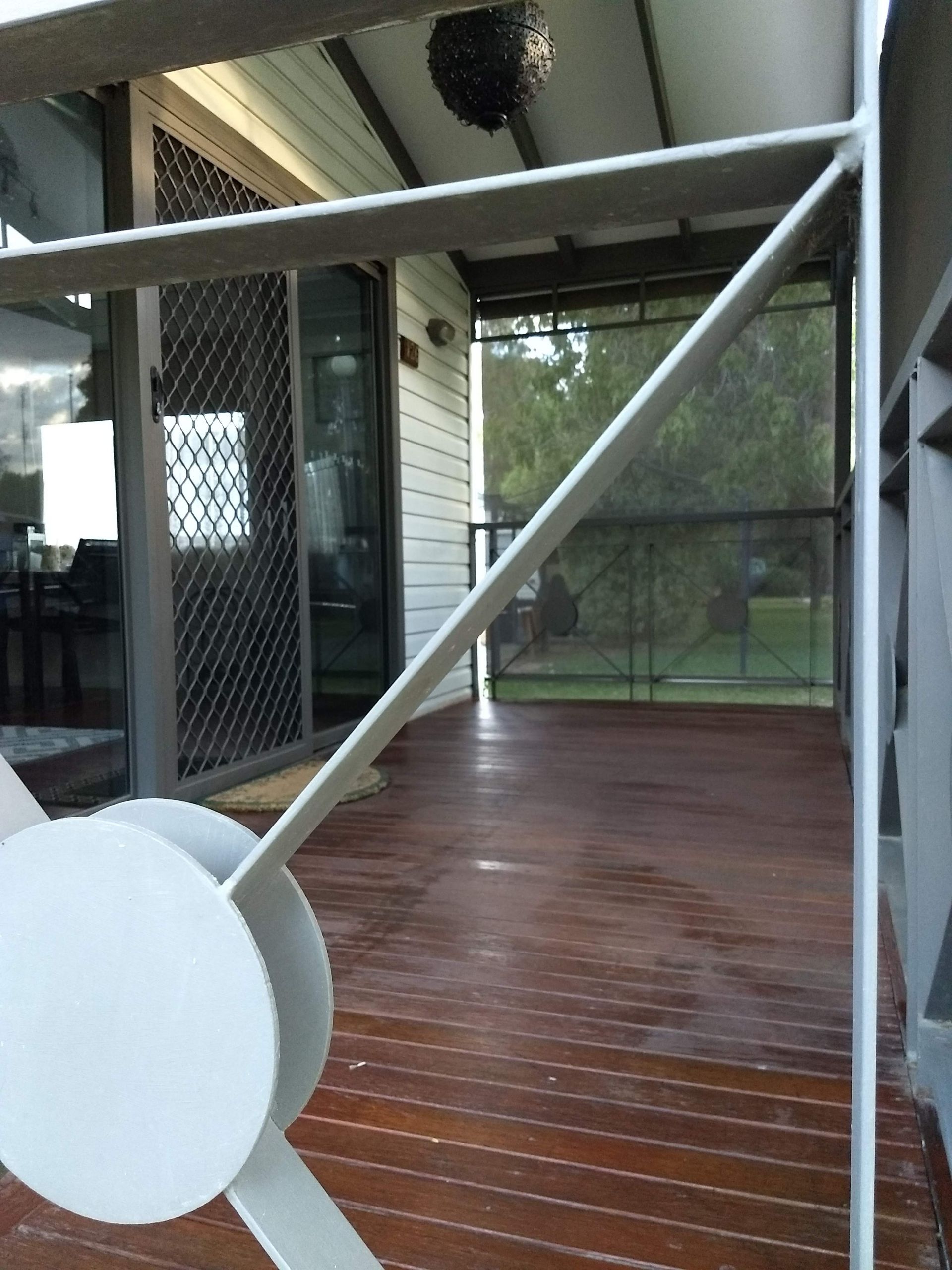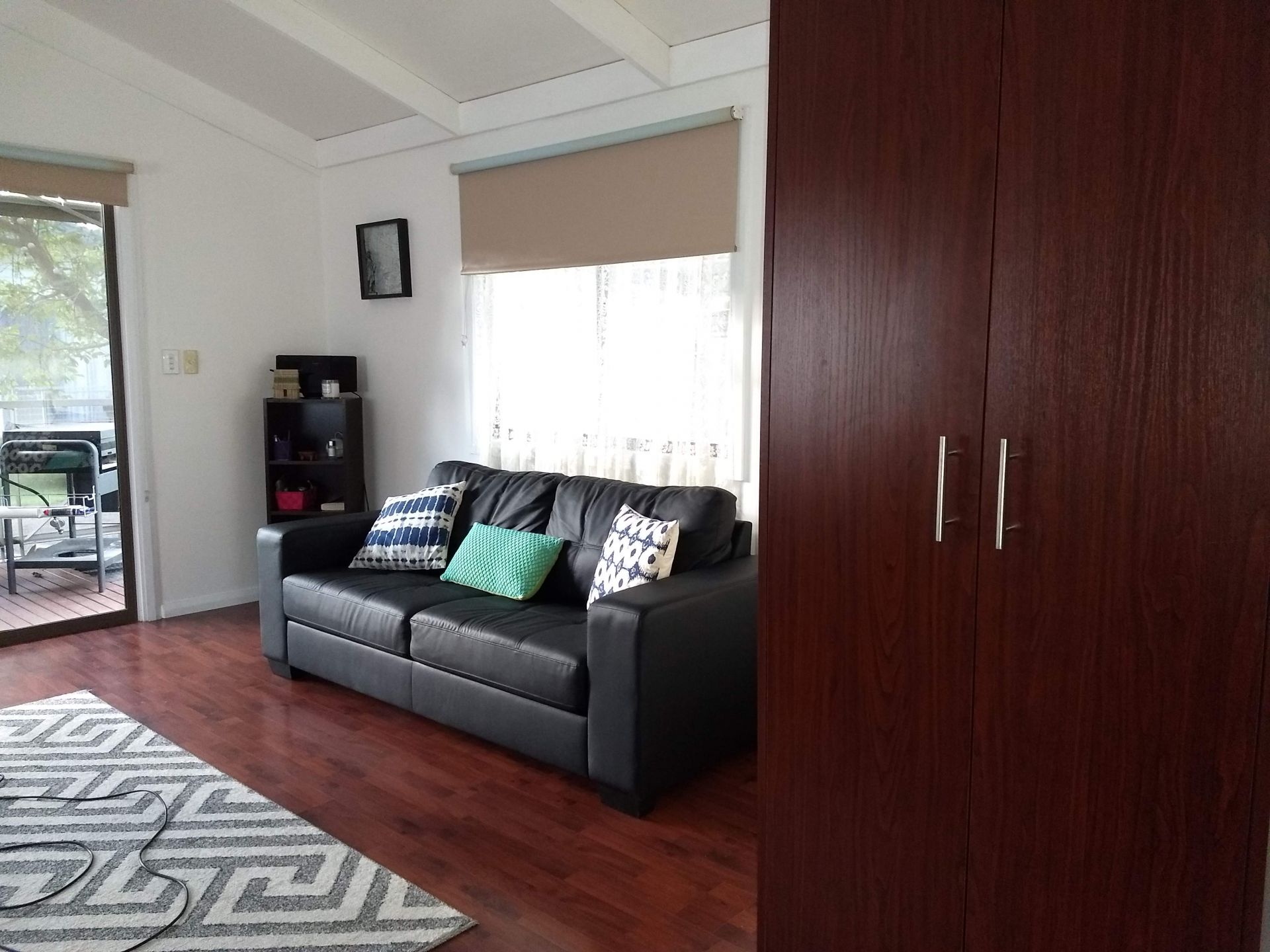 Sliding door on to fully covered deck with privacy blinds.