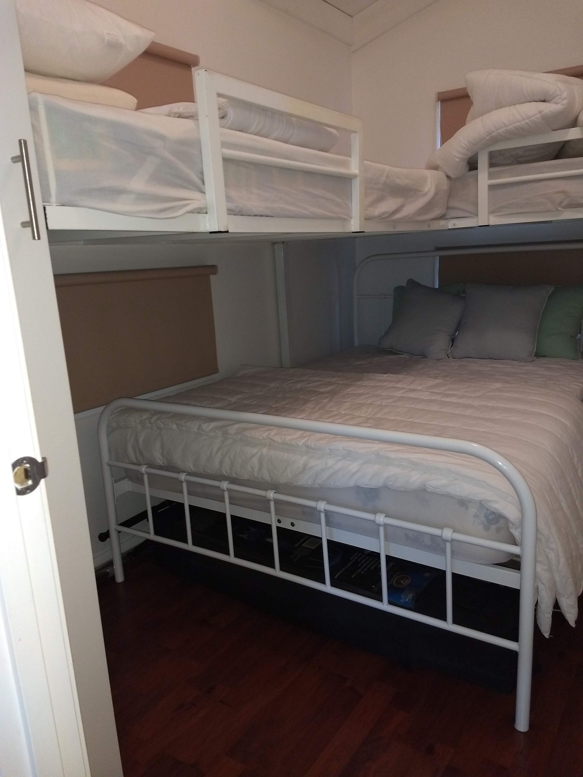 Second bedroom has a double bed plus two single bunks with a small built in cupboard.