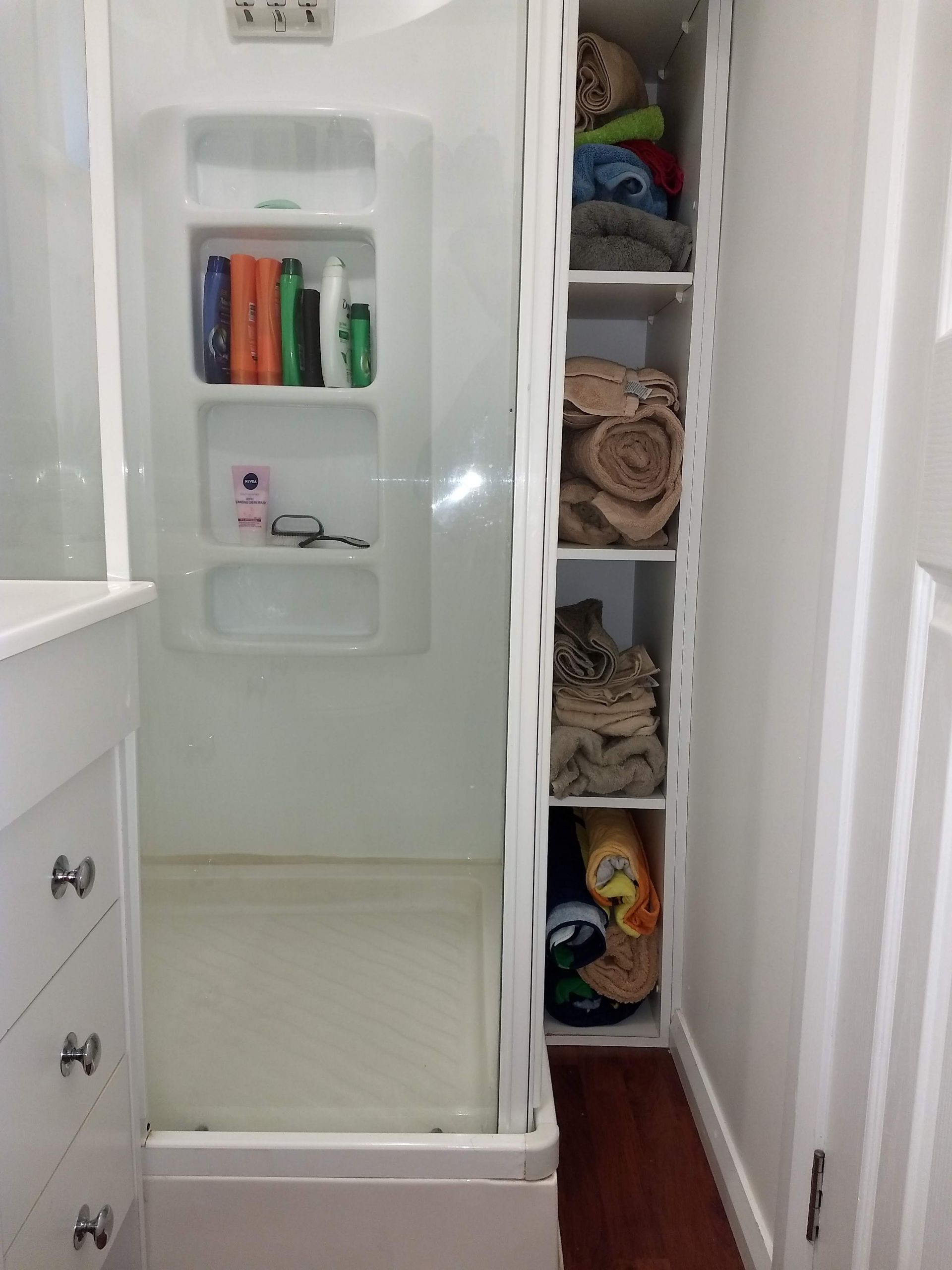 Bathroom with toilet, shower, vanity and heating.
