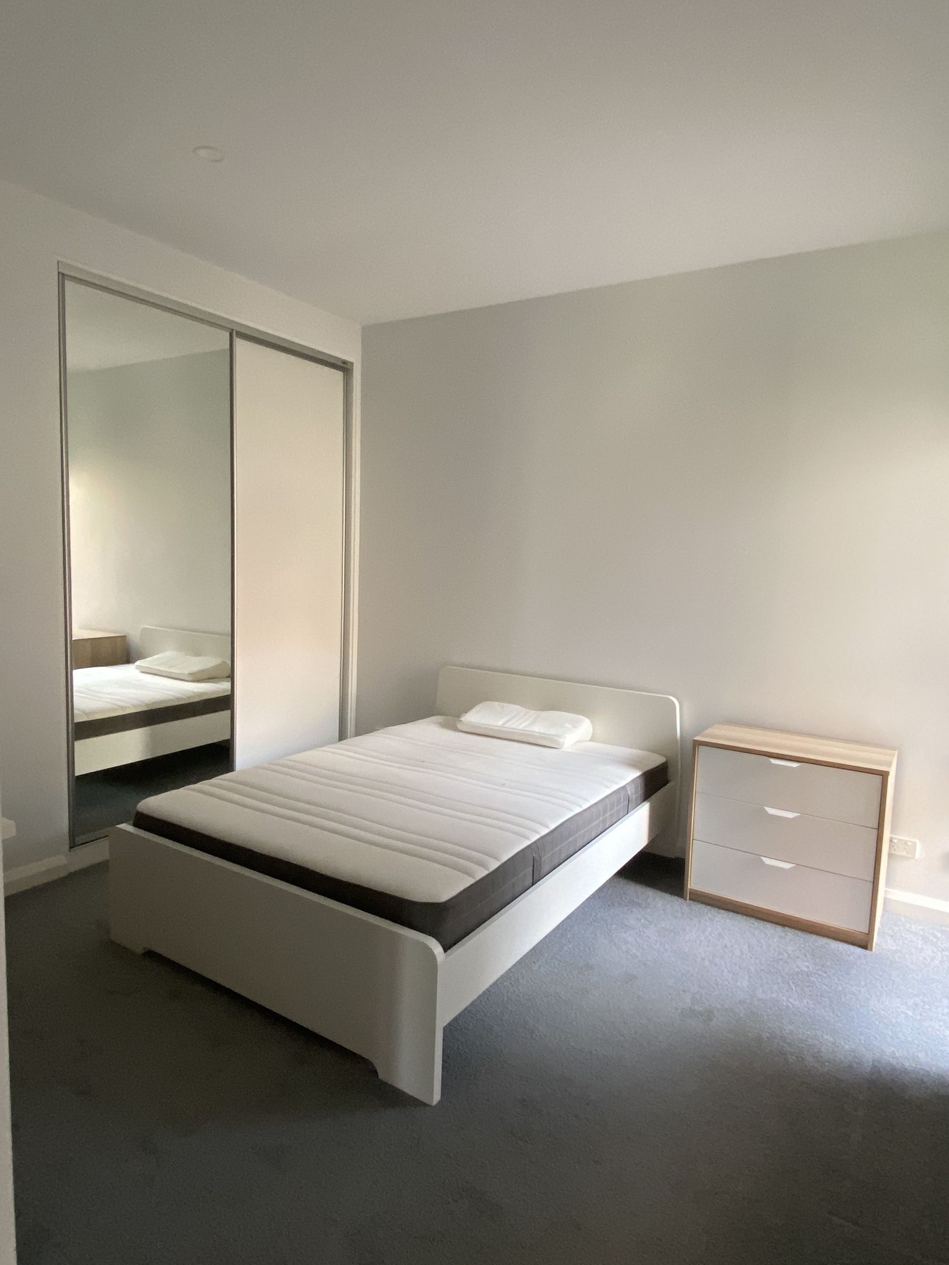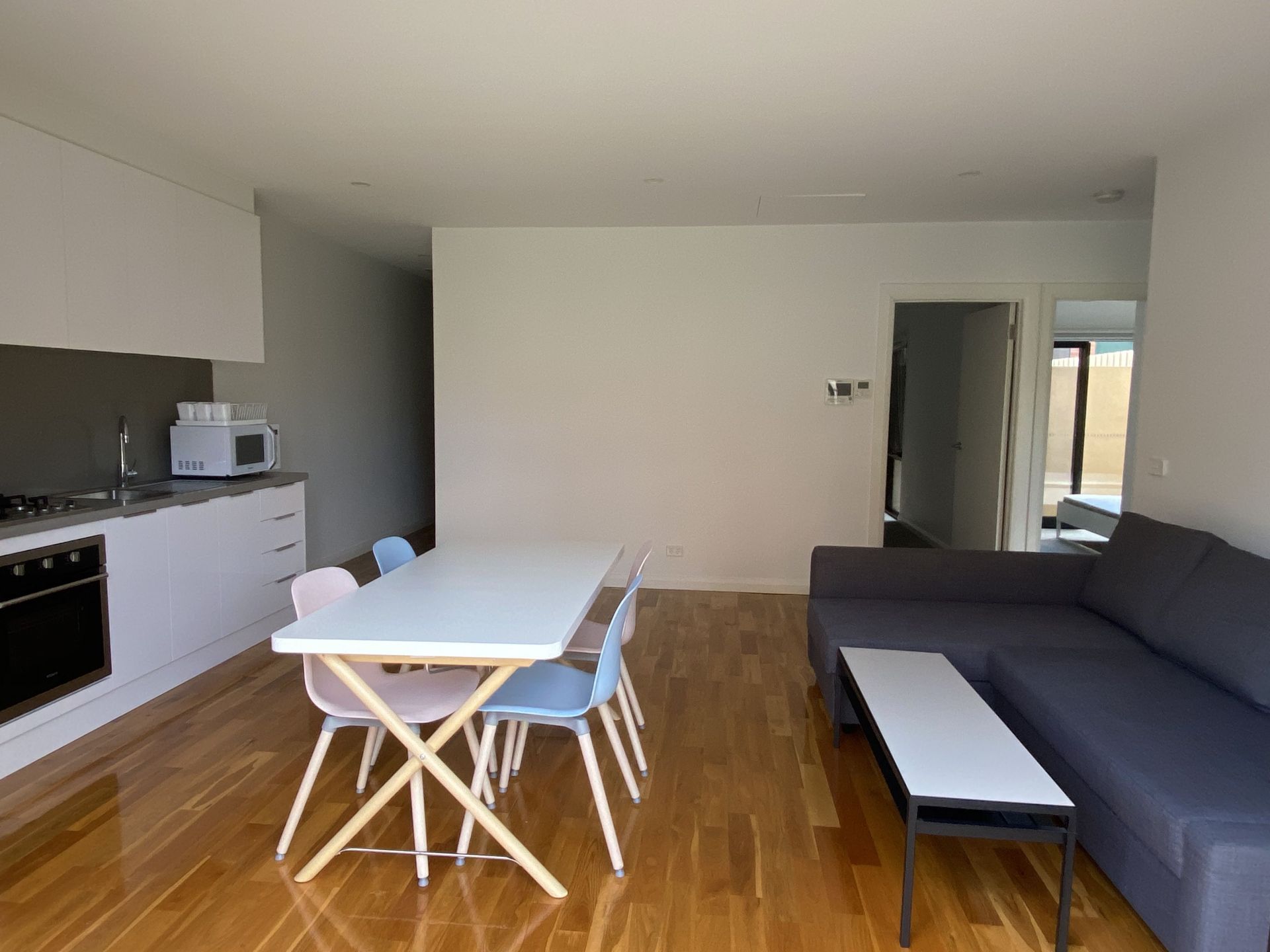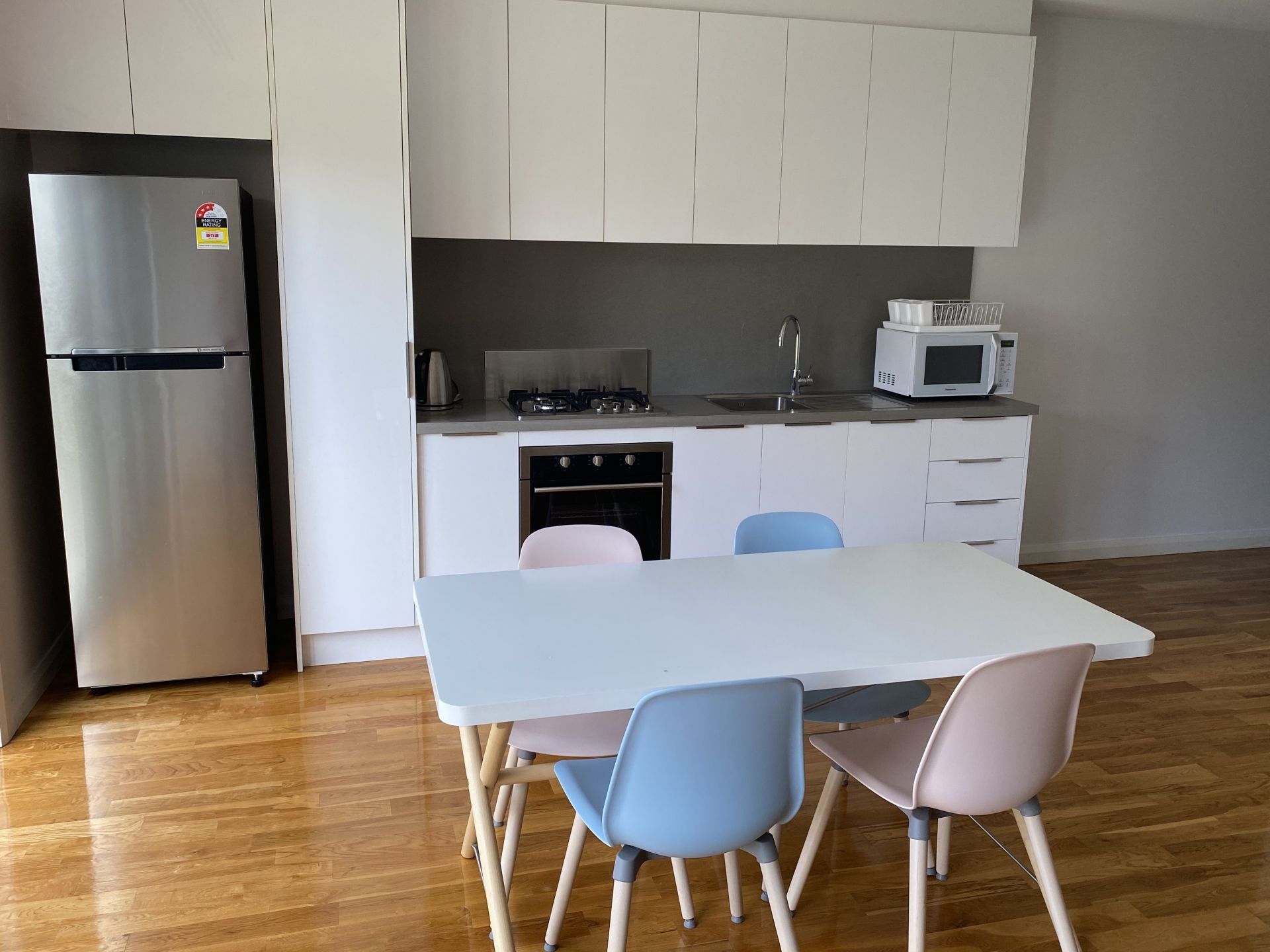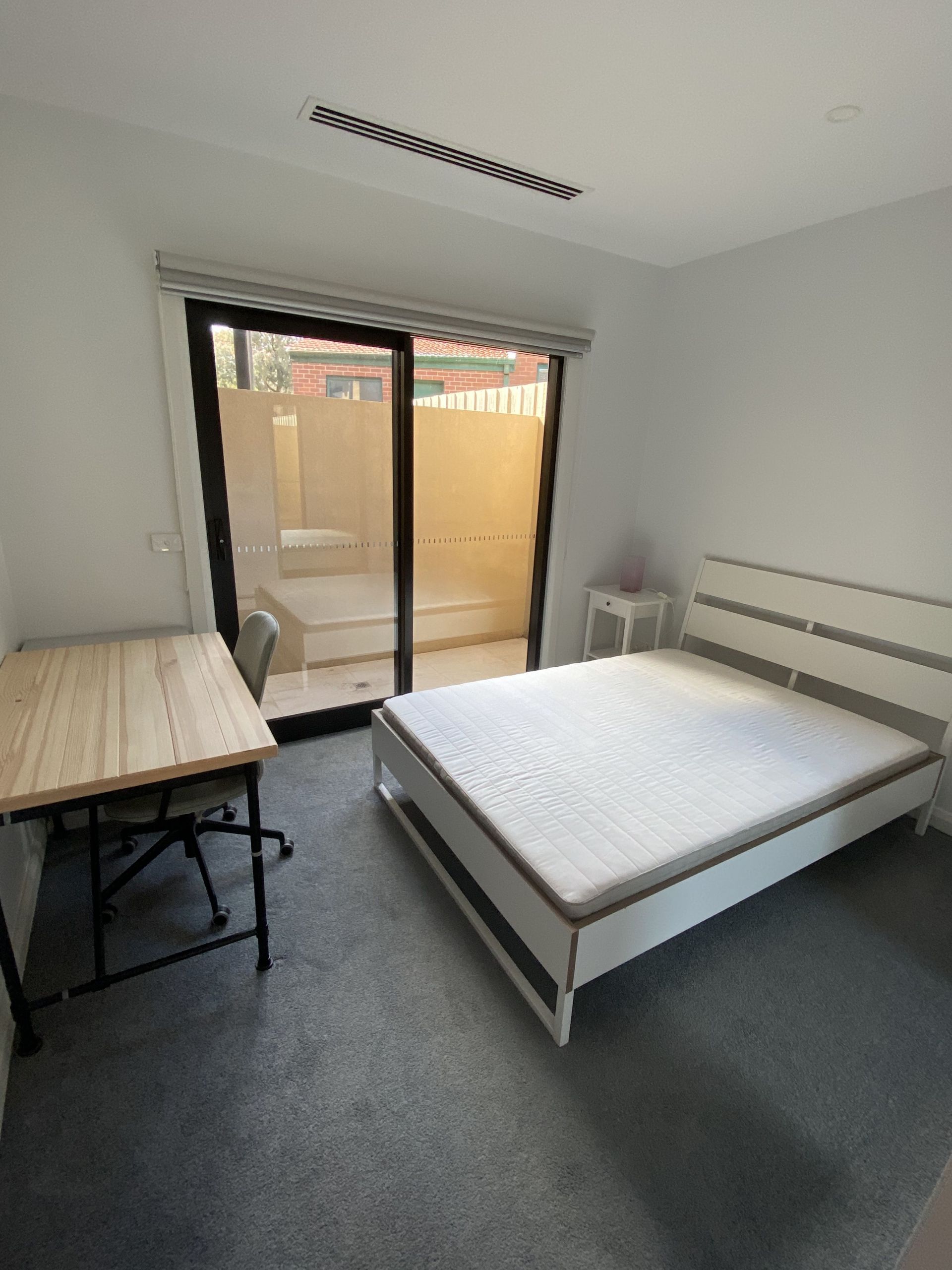 This modern apartment is equipped with all that you need for a smooth and easy move in. Heating/Cooling throughout with large sliding doors leading to the private backyard. All 3 bedrooms are carpeted and include beds, side tables and built-in wardrobes. Also included are 2 desks with chairs for studying or working from home. The kitchen has a caesar stone benchtop and splashback, 4 burner cooktop including WOK burner, oven, stainless steel fridge, microwave and kettle. There is a L shaped lounge suitte with built in storage and roll out bed while the dining table with 4 pastel coloured chairs which compliments this space.