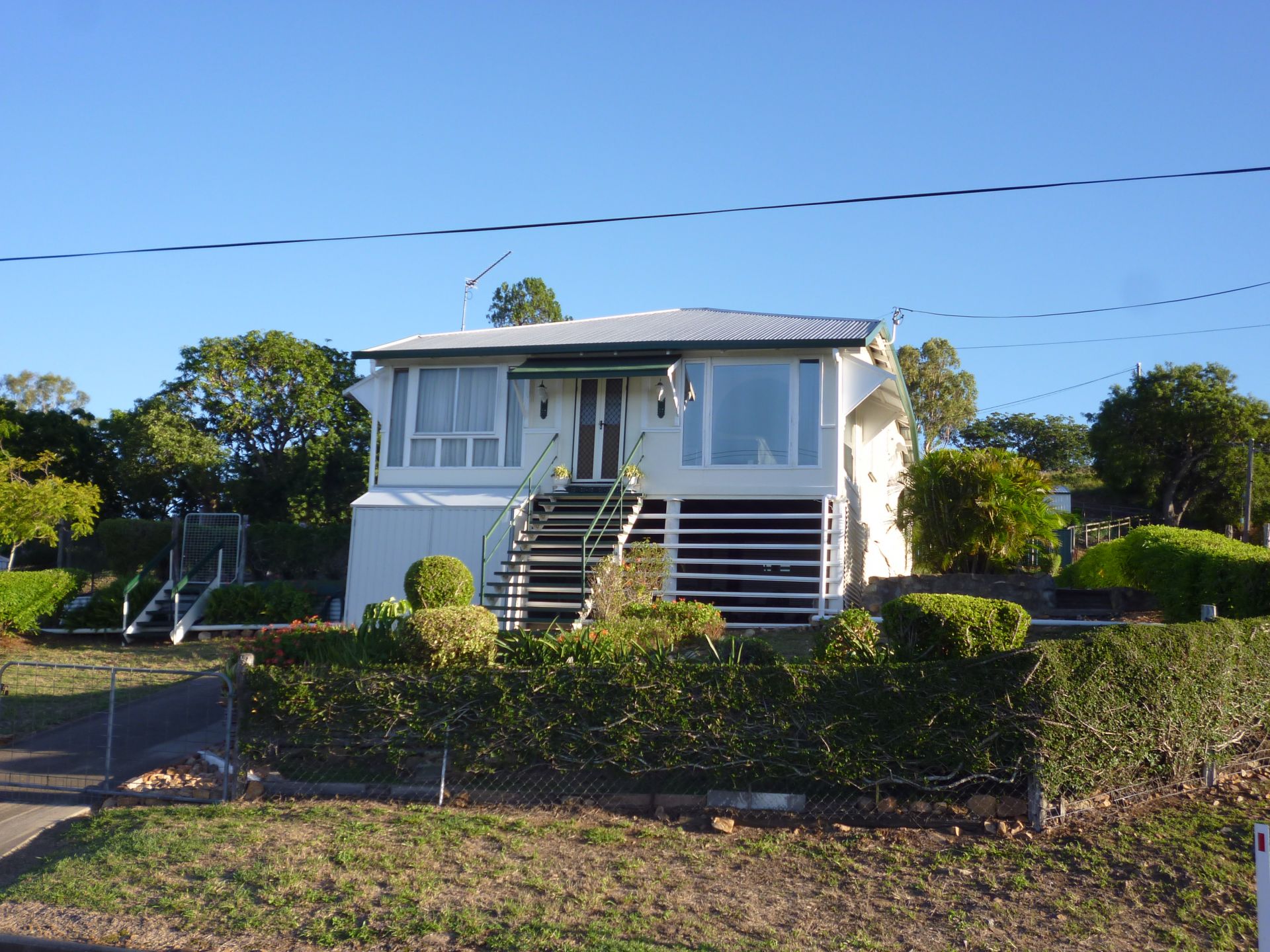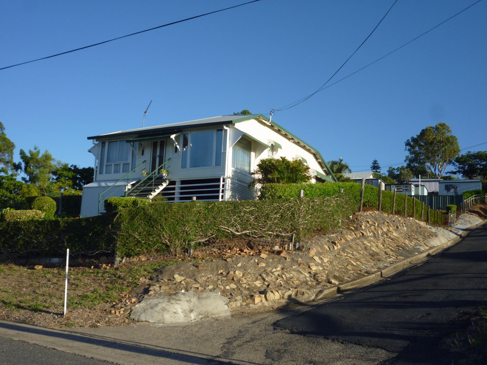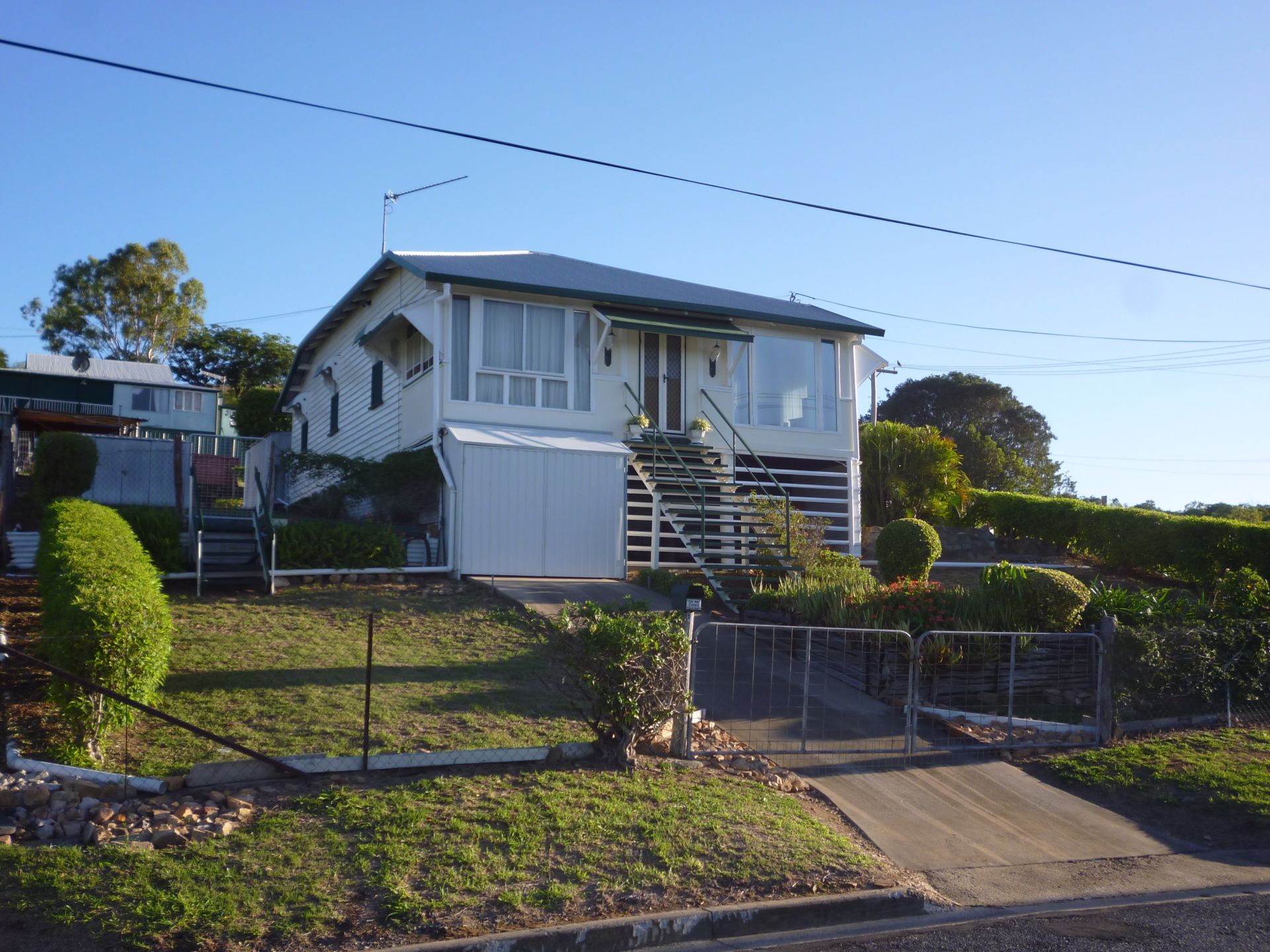 You are sure to be impressed as you view this classical and traditional extremely sound high blocked residence, beautifully set on gently sloping hilltop 1127m2 fully fenced corner allotment .From the alfresco covered entertainment area at the rear with its laid back relaxing atmosphere you enter the large built in eat in kitchen. As you proceed through the home towards the ornate antique dinning room with its attractive regal quality Alpaca curtaining you will pass through an open area ideally used as an office. Relax with pride as you look across the double lounge with huge clear glass panels and million dollar views. There are 3 bedrooms, easily added a 4th,separate toilet and bathroom. Ancillary buildings include 2 storage sheds, and a triple carport, accessed trough double gates on the spare building block, with water and electricity at gate from the secondary bitumen street frontage. The ultra-neat fully concreted, enclosed and lockable garage under house area easily accommodates the family car with its ample entertainment area. Lawns and gardens presented immaculate. Walking distance to CBD, Schools and Hospital. Also the building block is 506m2 and can be purchased separately