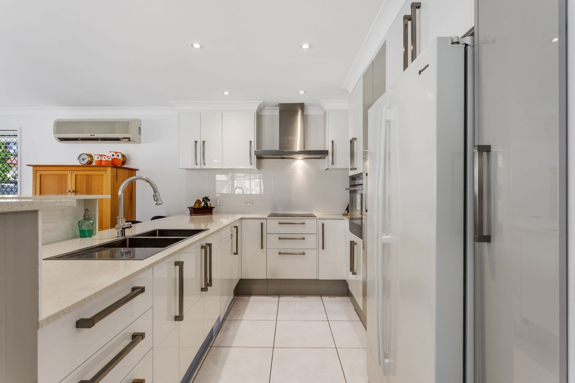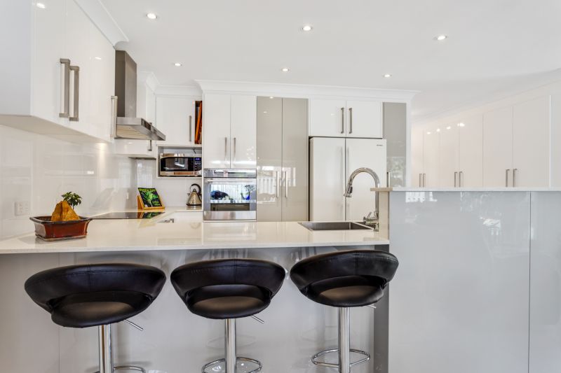 Modern kitchen with stone bench tops, quality appliances and plenty of cupboard space.