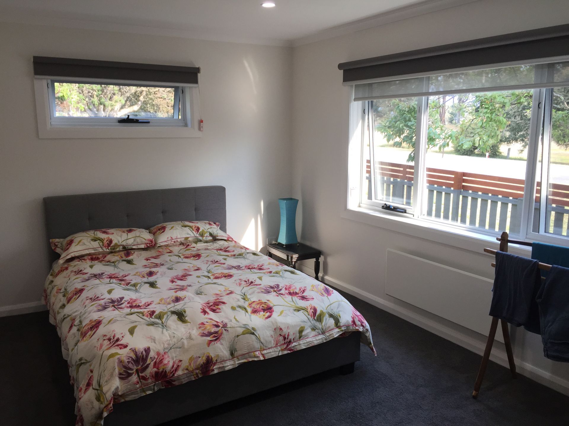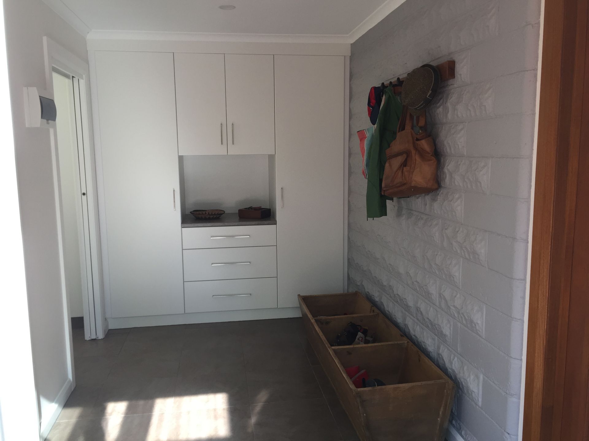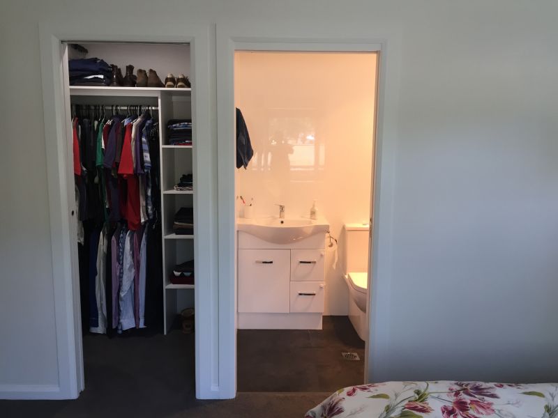 - A spacious 'mudroom' opening off the deck, with large built in cupboard and timber coat rail featuring convict made railway 'dog spikes';
