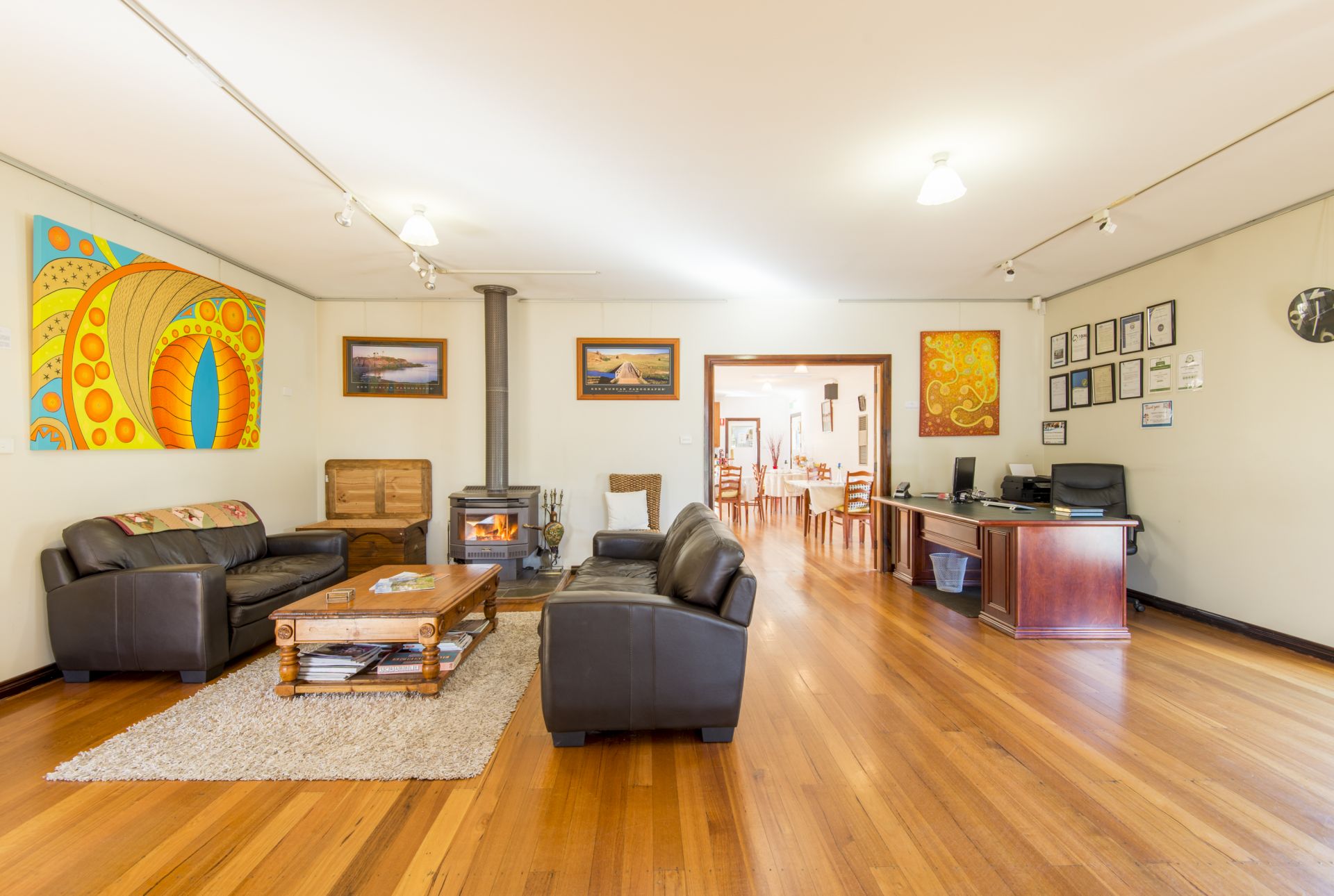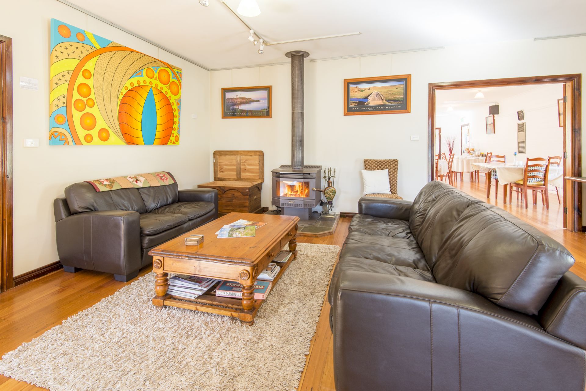 Large foyer and lounge room with inviting wood fire heater