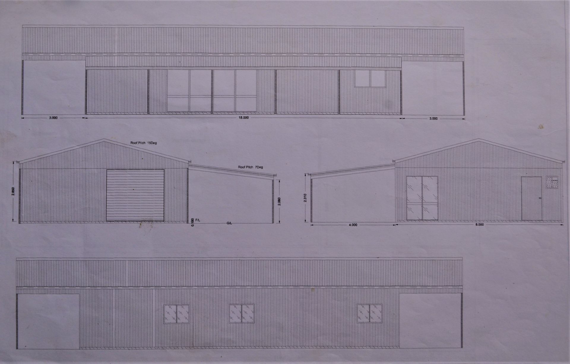 Cabin/Shed - 15m x 8m Galvanized iron construction - plus Verandah 15m x 4m. Carports at either end are an additional 8m x 3m each.