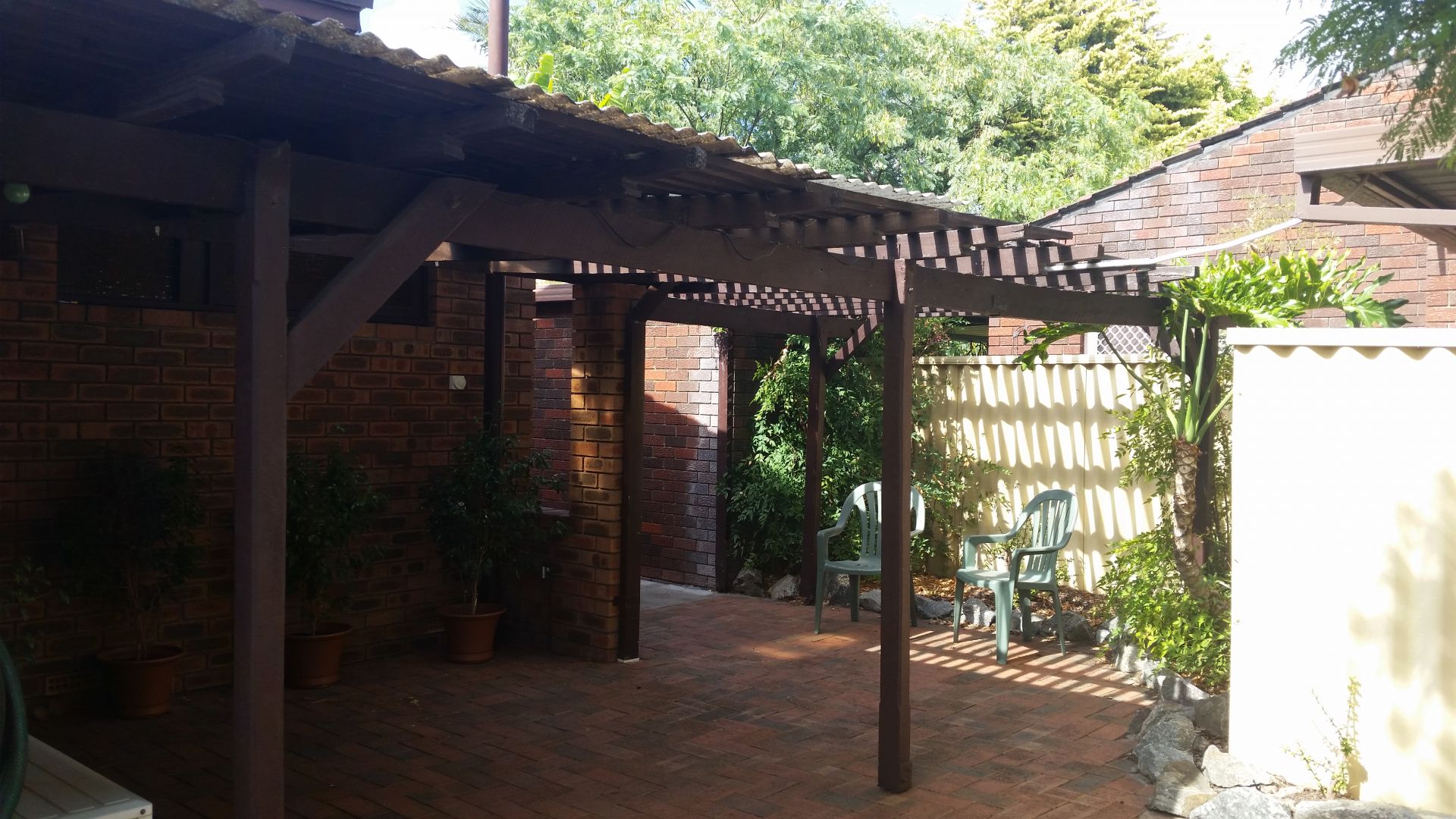 Low maintenance yard with a shady Jacaranda tree to relax under.