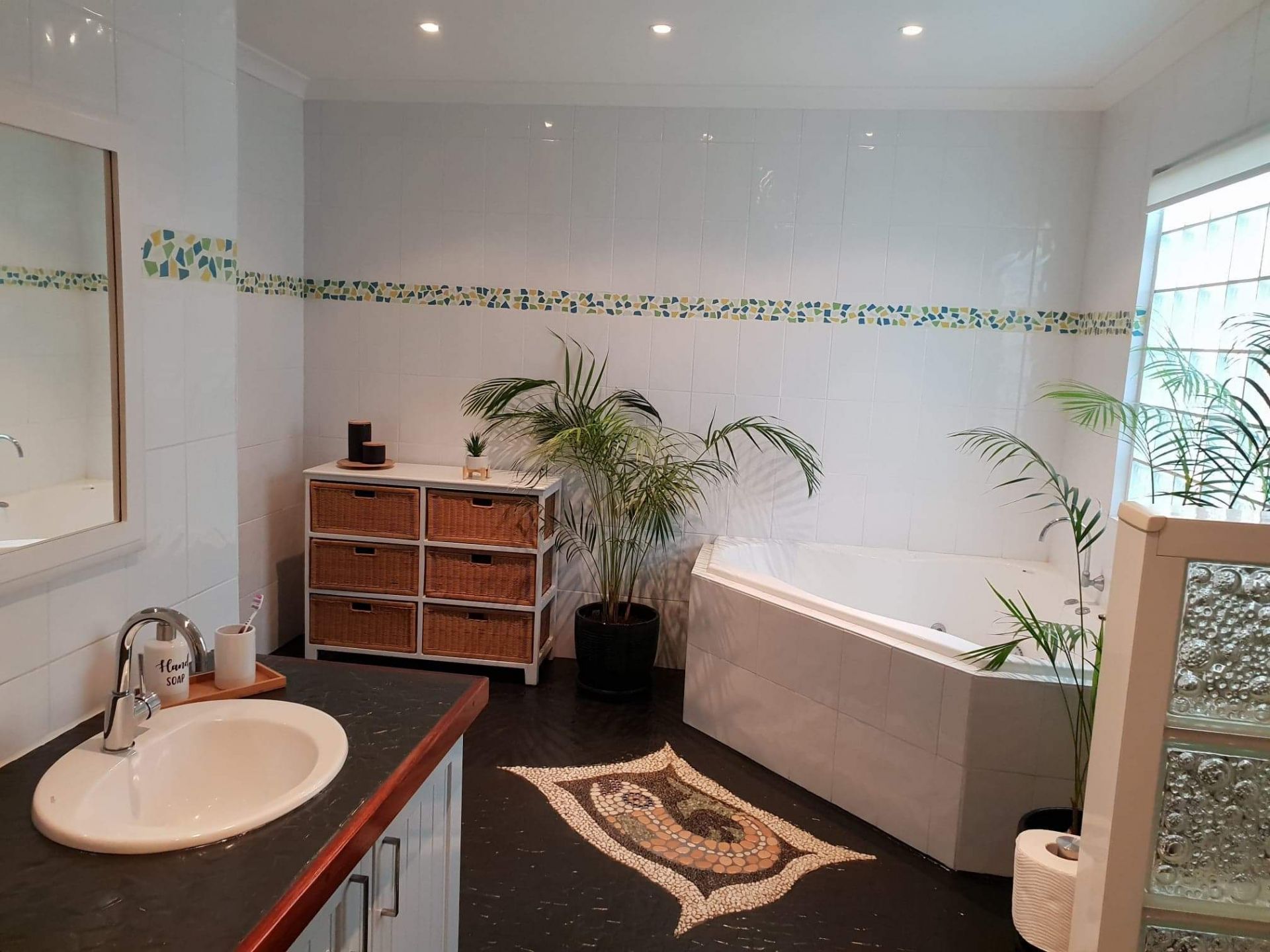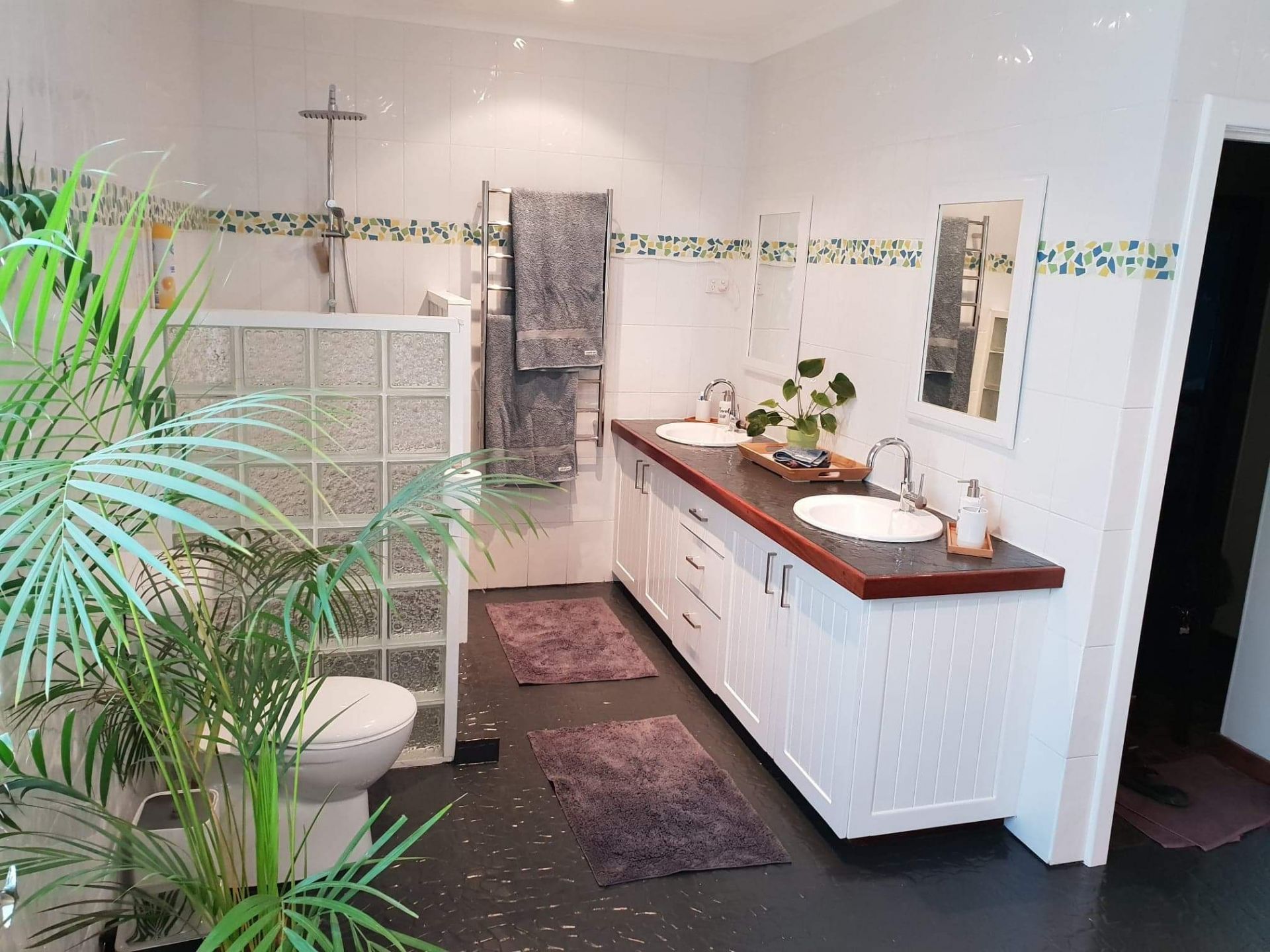 Huge bathroom with large double vanity, double walk in shower with Rainshower head, toilet and cnr spa bath.