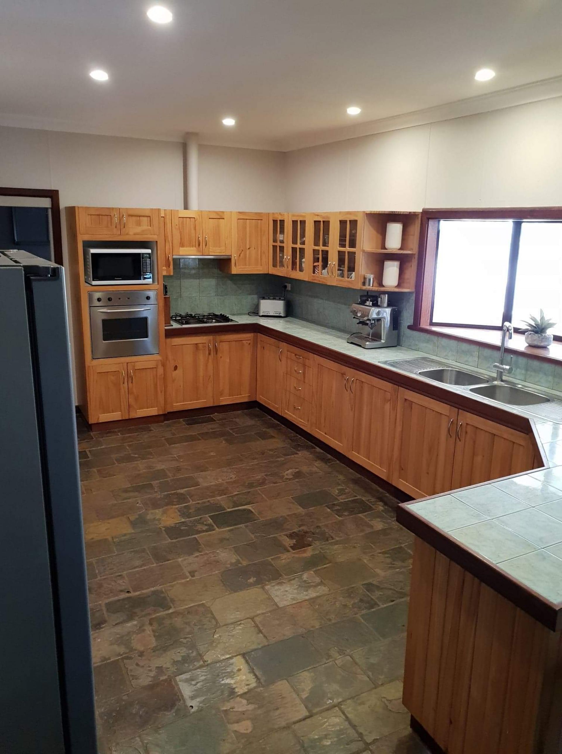 Large country kitchen with double sink, dishwasher, breakfast bar and loads of storage.Views to the pool and back yard from the kitchen sink.
