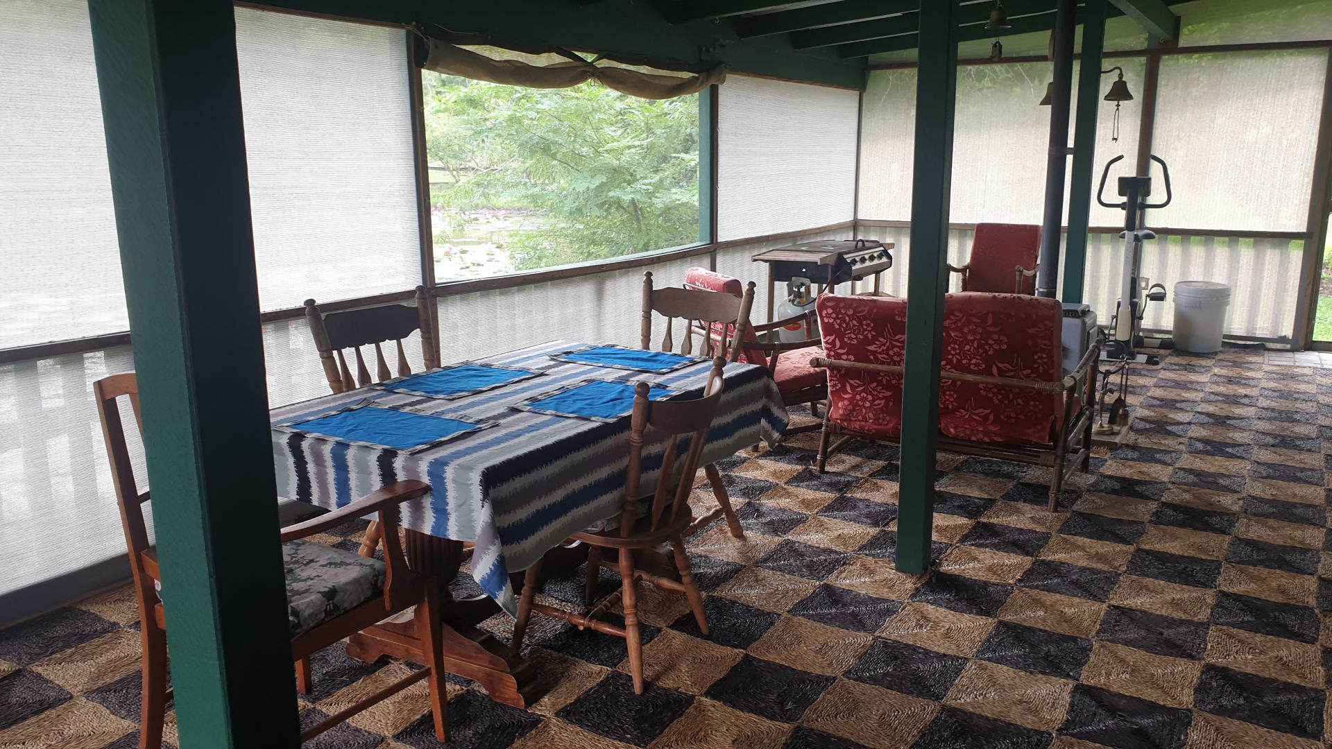 Apart from a large veranda out the back where the toilet and laundry are located, the house also boasts a huge fully screened front veranda that has been enclosed with waterproof screening and sea-grass matting on the floor to create a cosy and bug free outdoor living space, with a wood fireplace for those cooler winter nights.