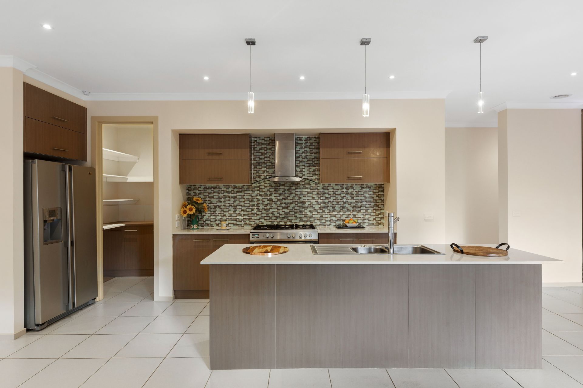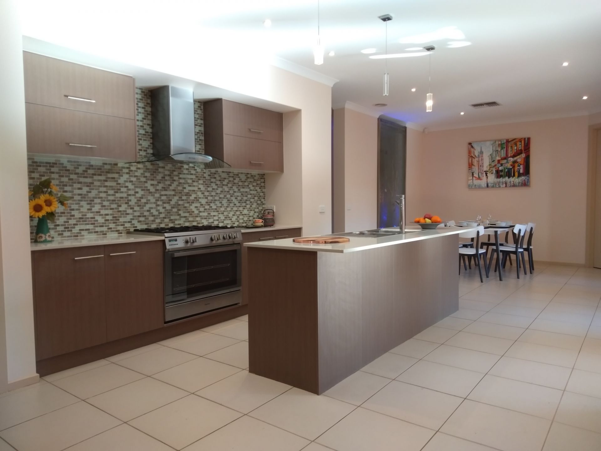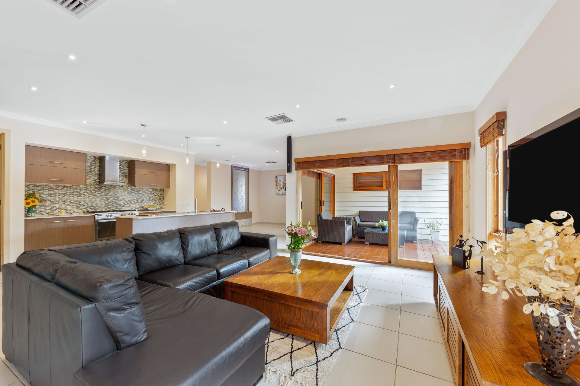 Open plan living with Lounge (fitted with Surround Sound System) large Kitchen Butlers Pantry and Stone Bench Tops fitted with Stainless 900mm Cooker, Dishwasher and built in Microwave.
