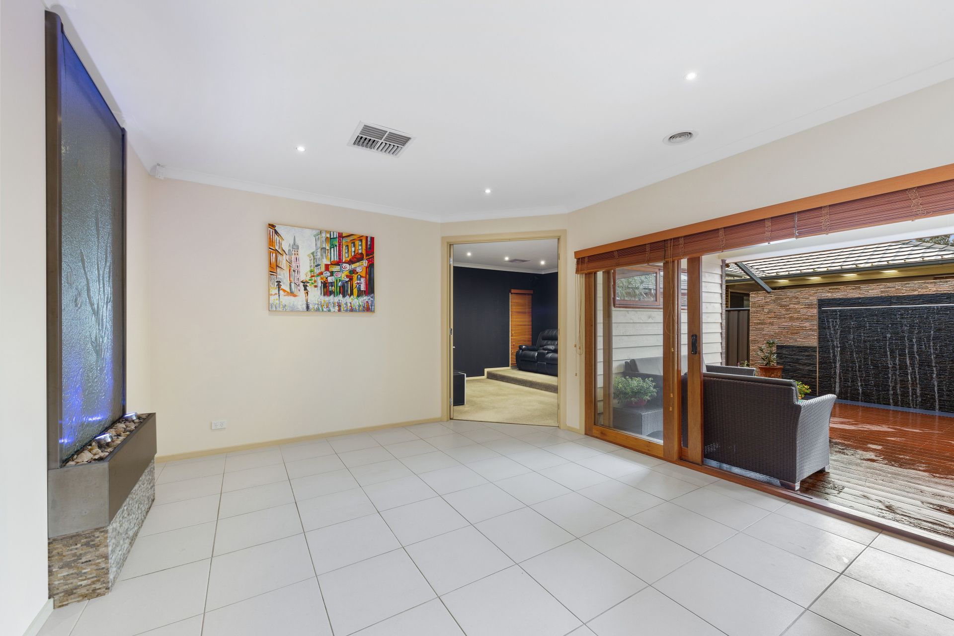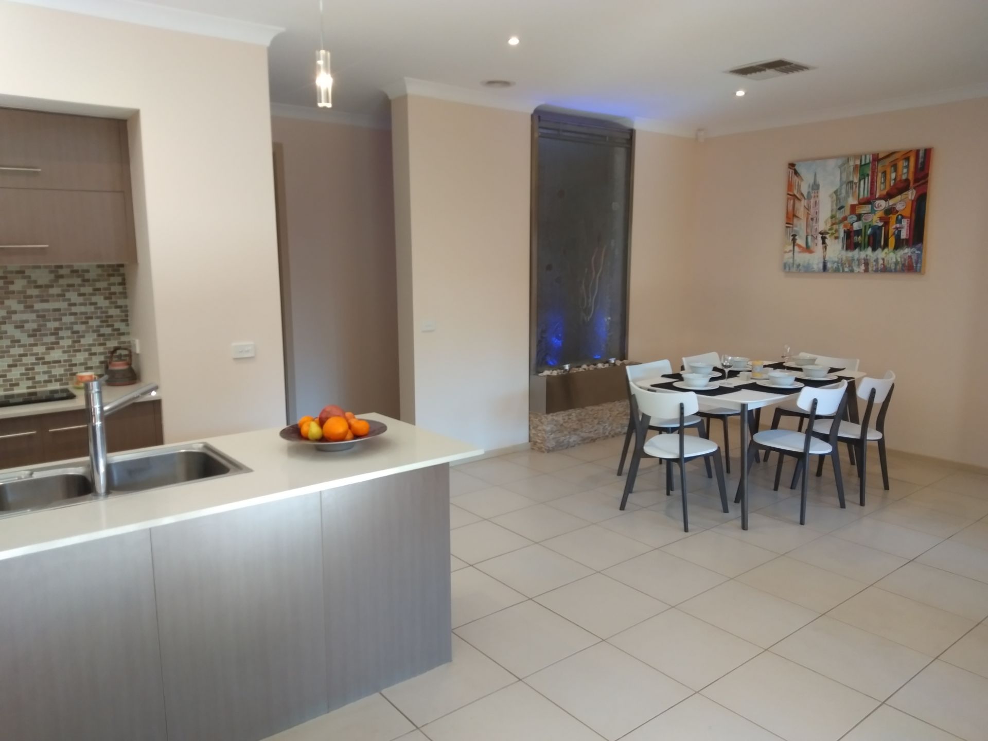 Dining area & Piazza both featuring beautifly detailed water fountains, Sliding doors fully opening onto the Piazza decking.