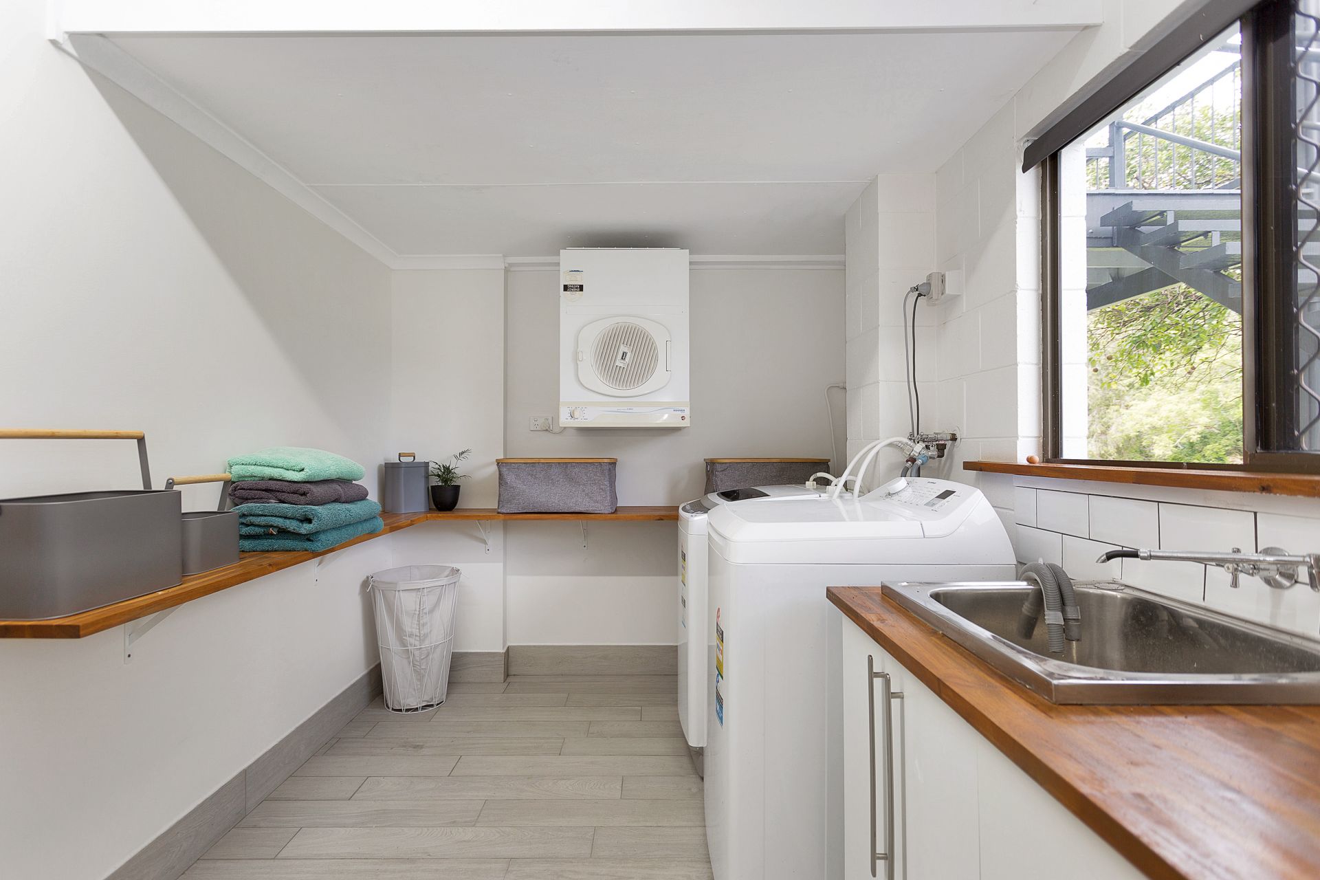 A shared laundry with room for 2 washing machines is lockable to separate the downstairs unit ensuring privacy. 6 of the 7 Mitsubishi HD rev cycle air cons are brand new installed in every bedroom and living area. Security screened up and down.