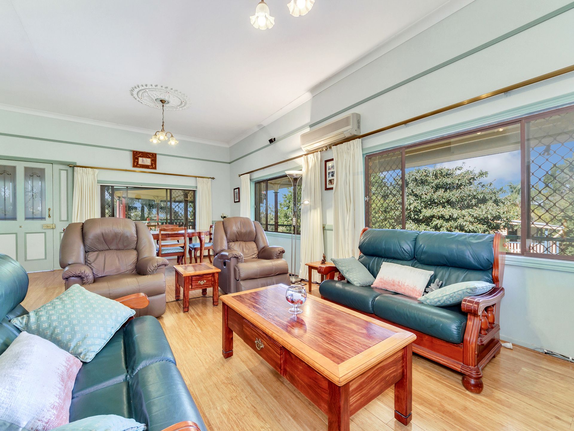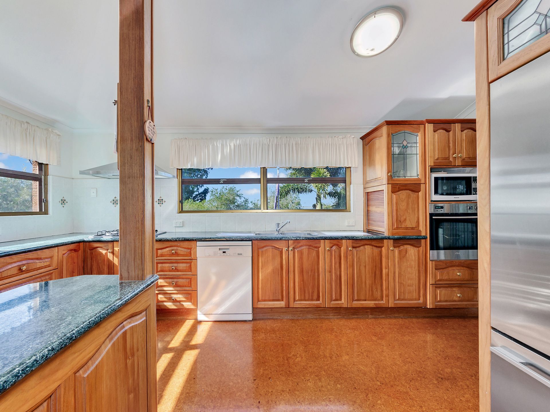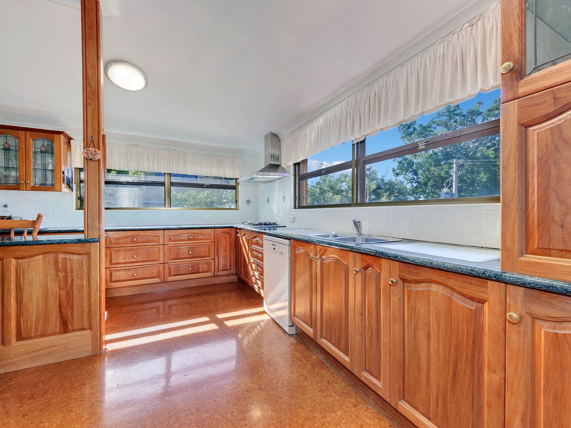 House is double brick with verandas on 3 sides. Has three bedrooms, two bathrooms, study, big lounge and dining upstairs. High VJ ceilings, natural ventilation and two ACU. Bamboo floors upstairs. Kitchen and breakfast area with cork flooring. Kitchen outfitted with gas cooktop, electric oven, dishwasher, large pantry and plenty of storage.
