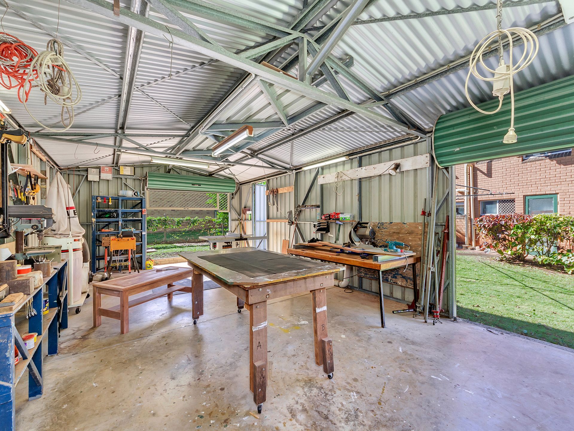 Large Titan shed (4.7 x 9m) fully wired as a workshop with three roller doors and two access doors.